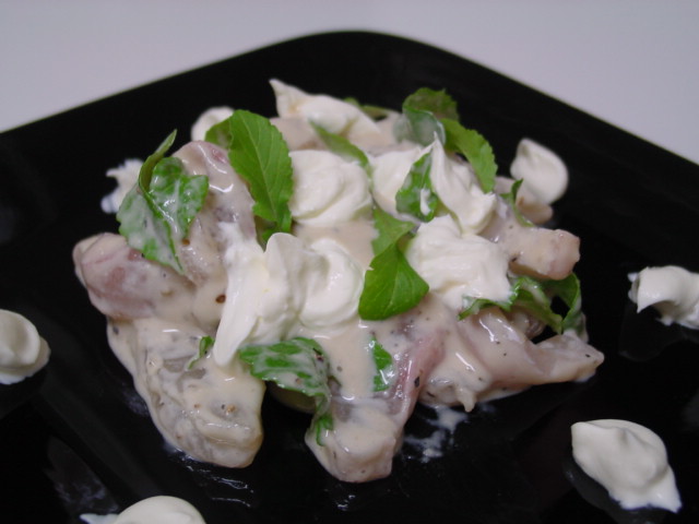 **ルッコラを一緒に和えています。白いクリームは、生クリームとレモンをミックスしたものですが、このお料理にはこれが欠かせません。