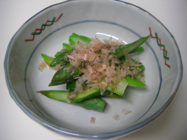 細めのグリーン・アスパラを茹でて、お醤油とかつをぶし削りをかけました。