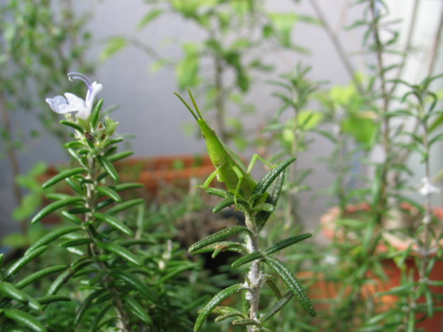 ← ローズマリーを登っている一昨日のバッタもっと上に行くつもりかな??