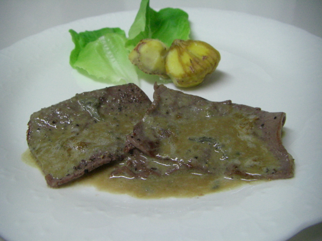 ゴルゴンゾーラとブルー・ドーヴェルニュを白ワインで溶かし、生クリームとバルサミコ酢を加えて作ったソースをかけた、牛薄切り肉のソテー。