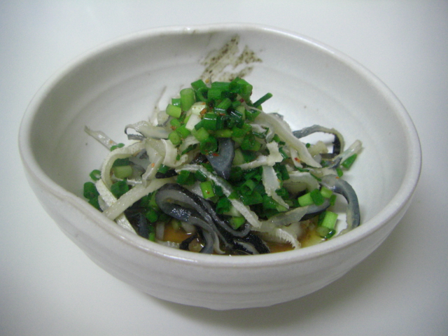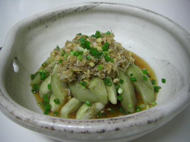 お茄子に揚げたおじゃこと生姜などのたれをかけました。