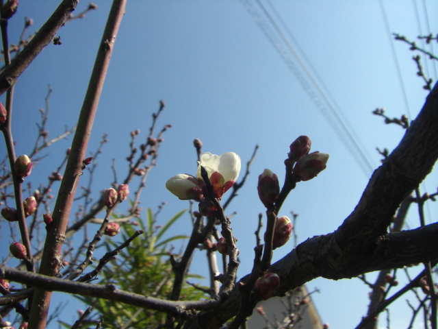 近くのお家の梅の木、いつもこの季節になるとお花のほころび具合が気になりますが、やっと5花くらい開いていました。