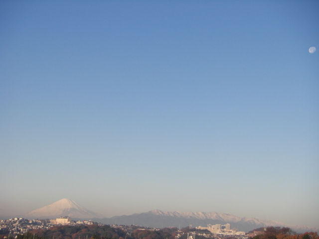 今朝午前7時過ぎに撮影しましたが、右の方に月も見えます。