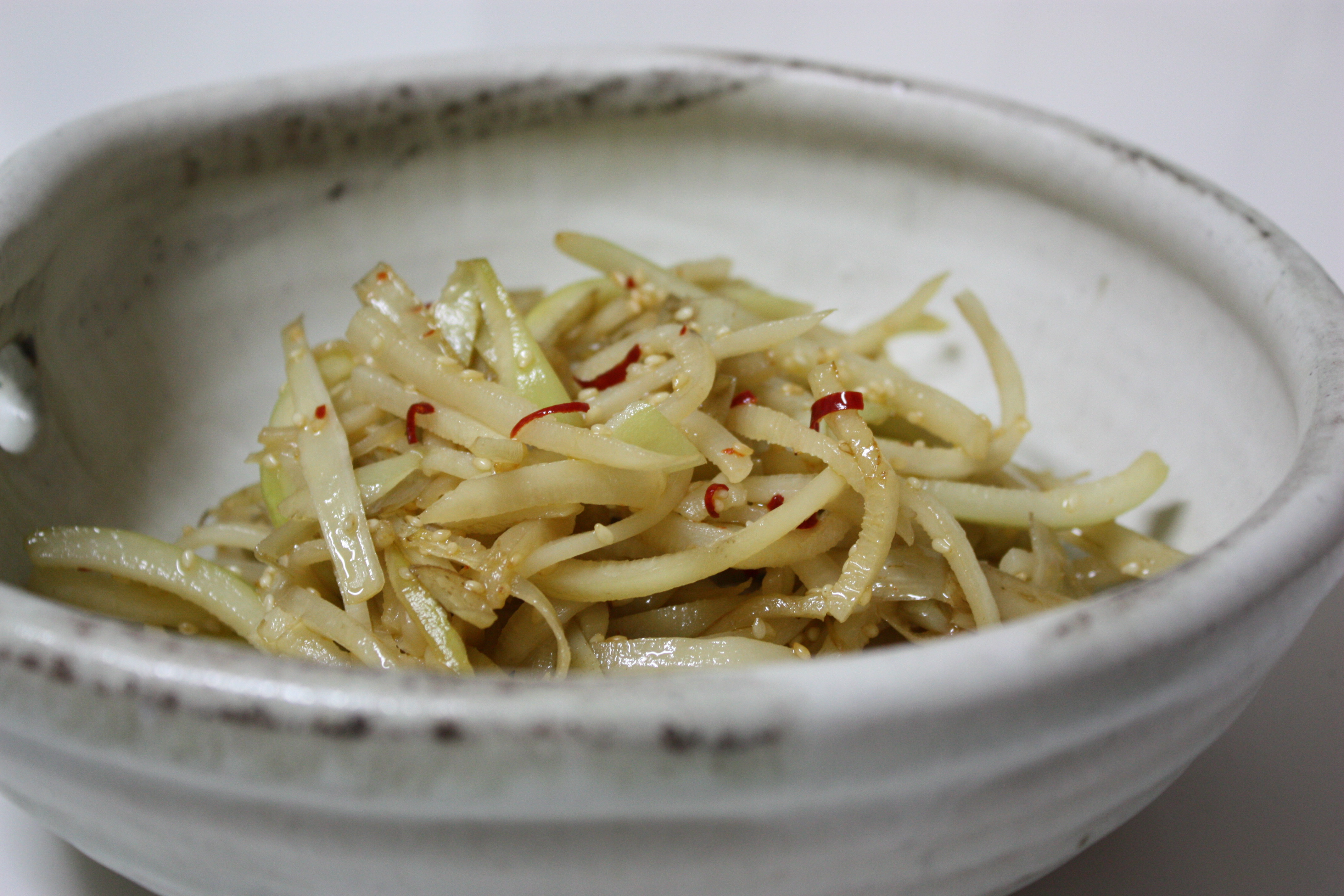 こうして食べてみると、大根の皮はふんにゃりしていますが、ウドの皮の食感がしっかりしていて、よりきんぴら向きの気がします。