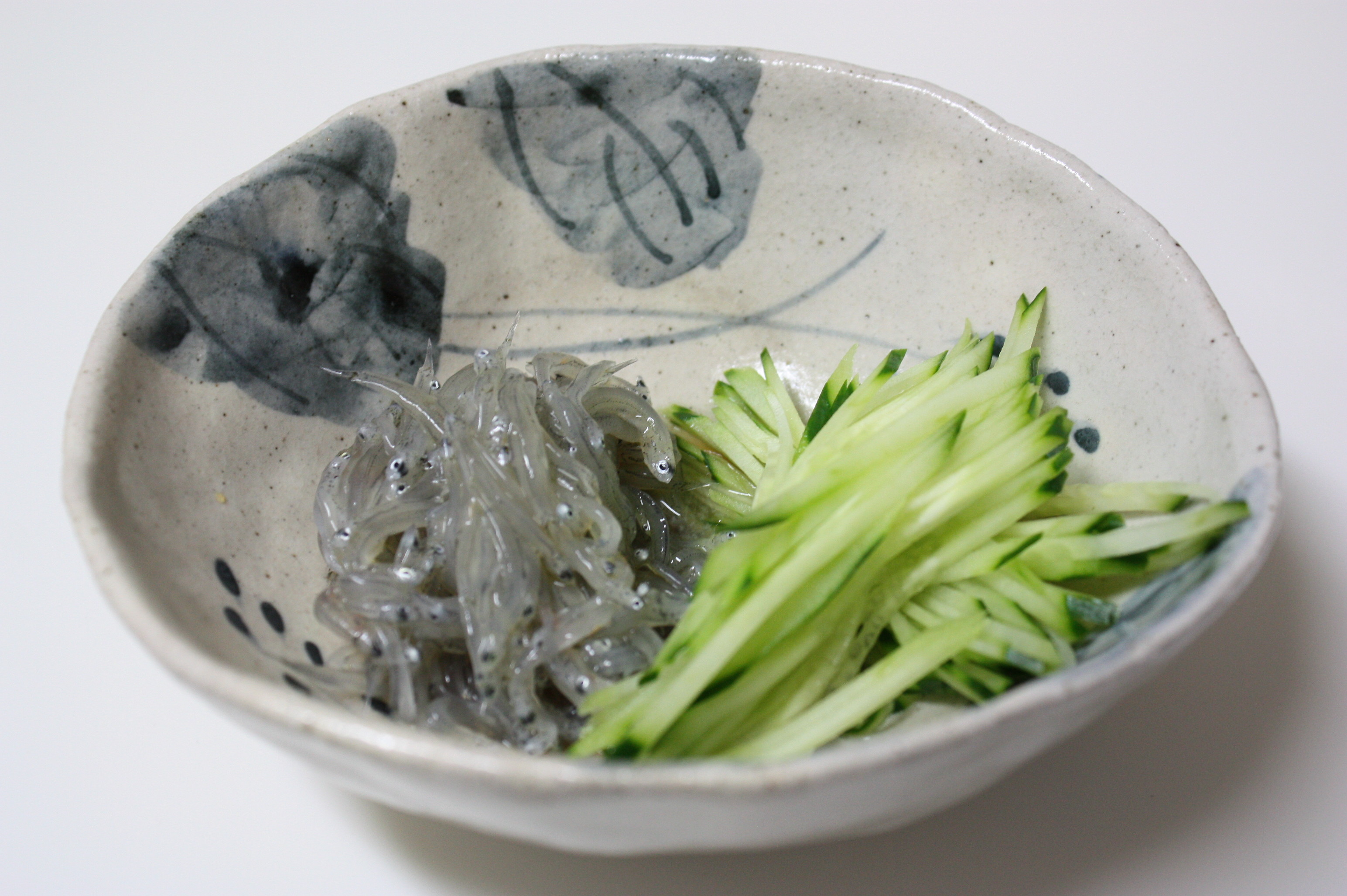 鶏のささ身の梅肉和えです。彼と一緒に買い物に行くと、自動的に茗荷とささ身がカゴに入ります。
