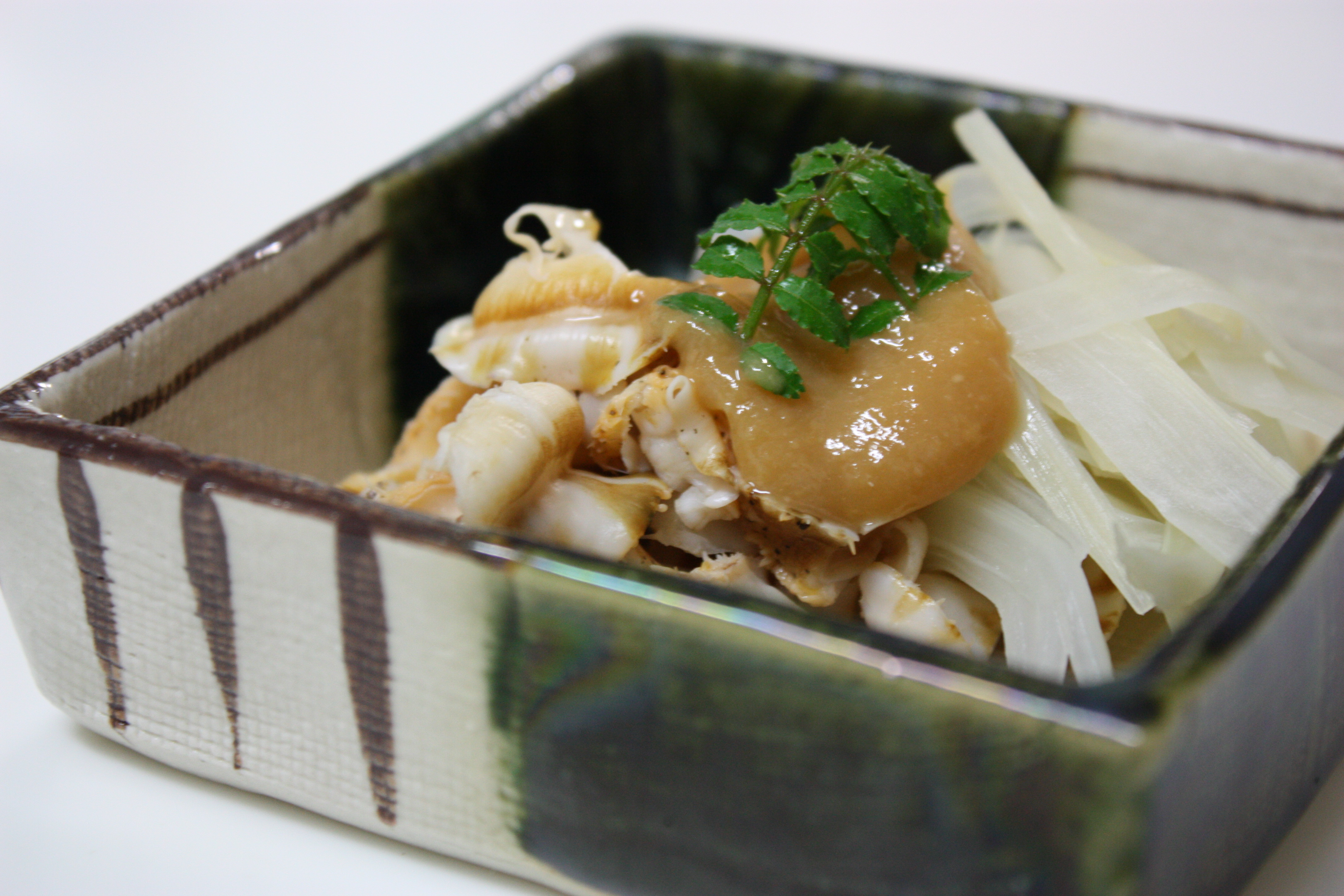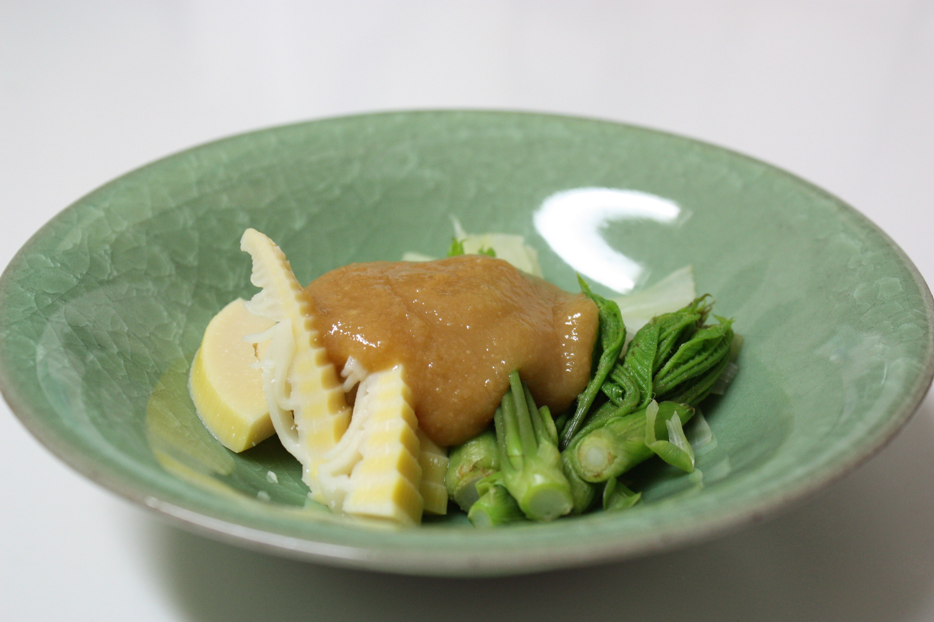 ウドと茹でたほたてのひもをぬたでいただきました。