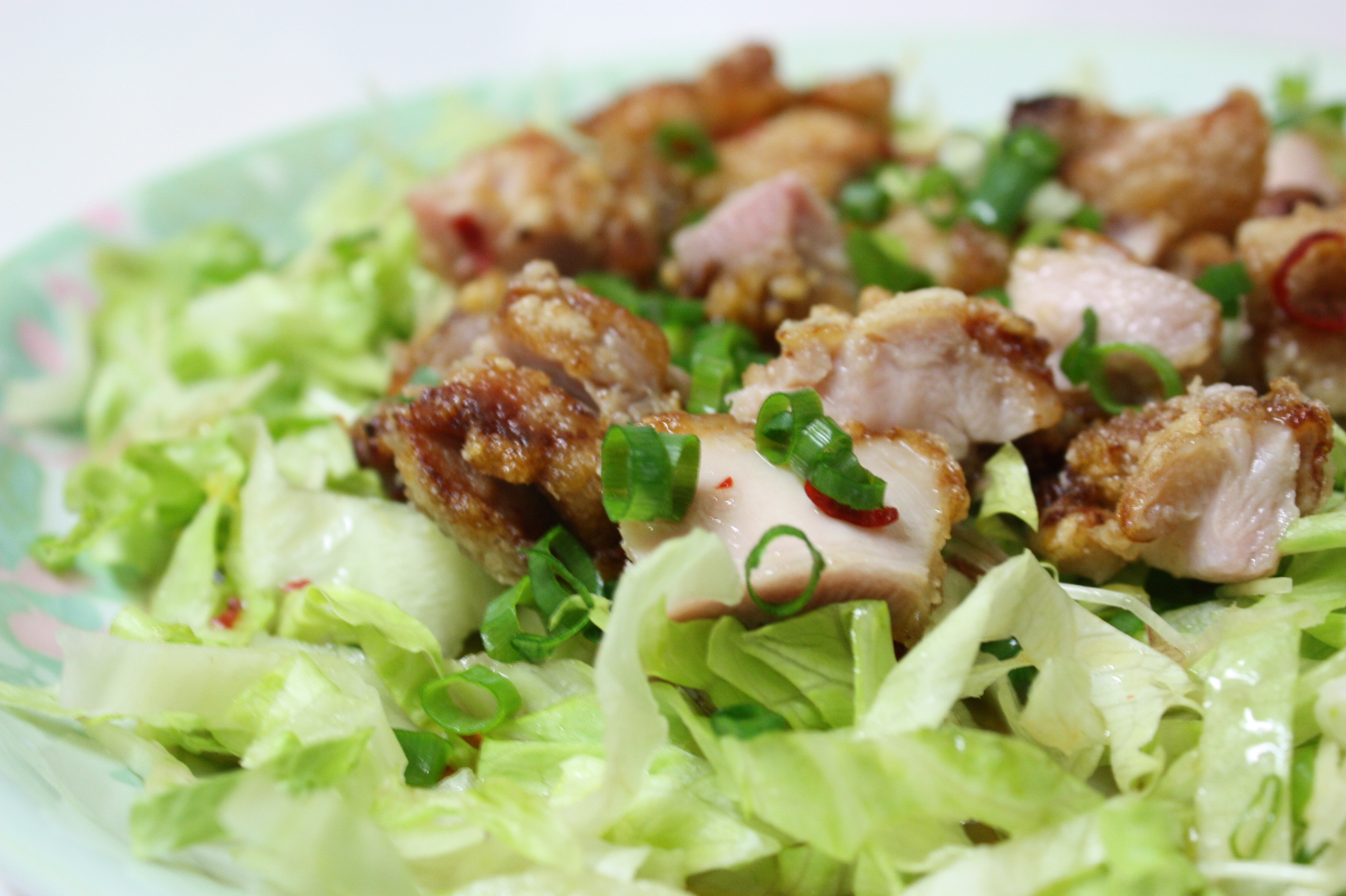紹興酒とお醤油に漬けた鶏もも肉を揚げて、お醤油にお酢とお砂糖、赤唐辛子を加えたタレをかけ、お葱を散らします。