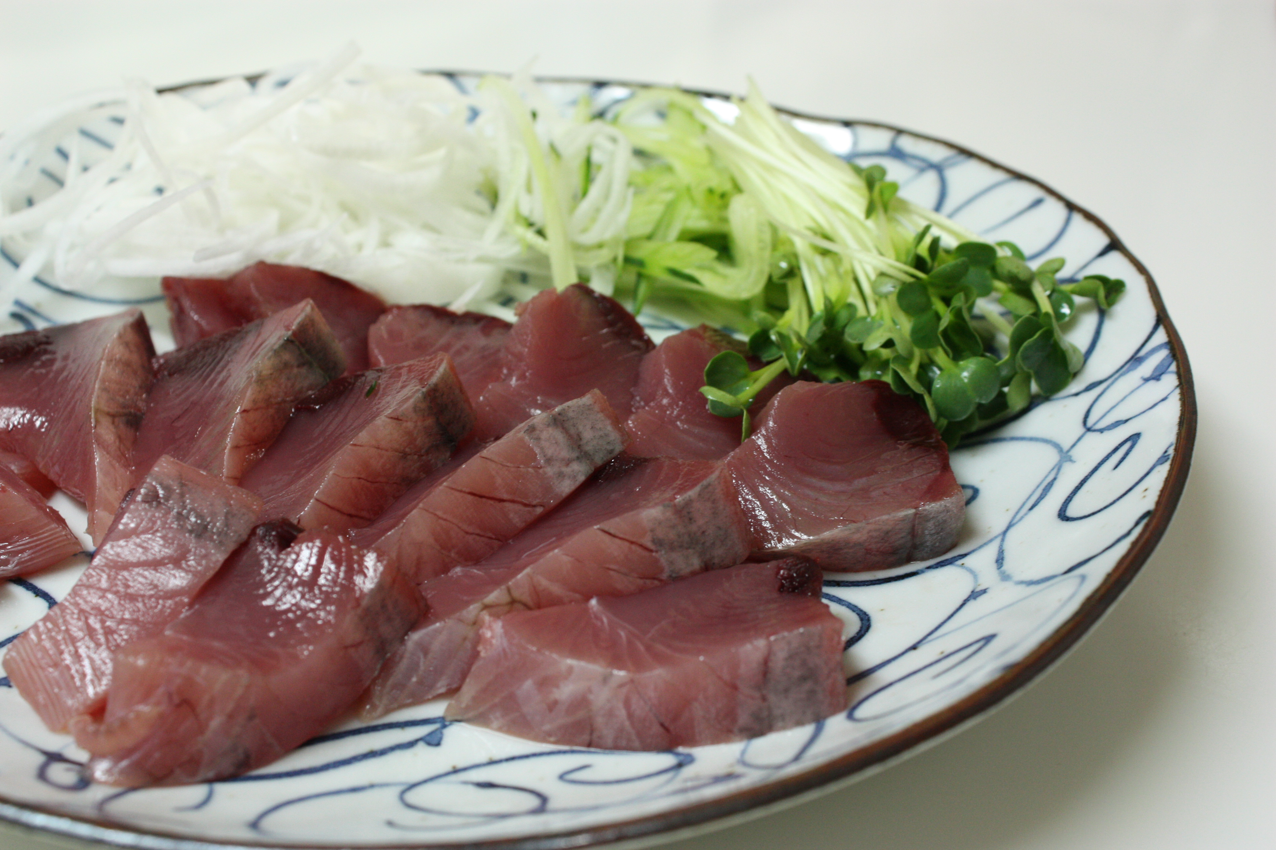 前の日に買ったり作ったりしてあった、お刺身系があったのをすっかり忘れて買ってしまったかつお。しかも、背と腹のセットです・・・食べきれないので、お醤油**