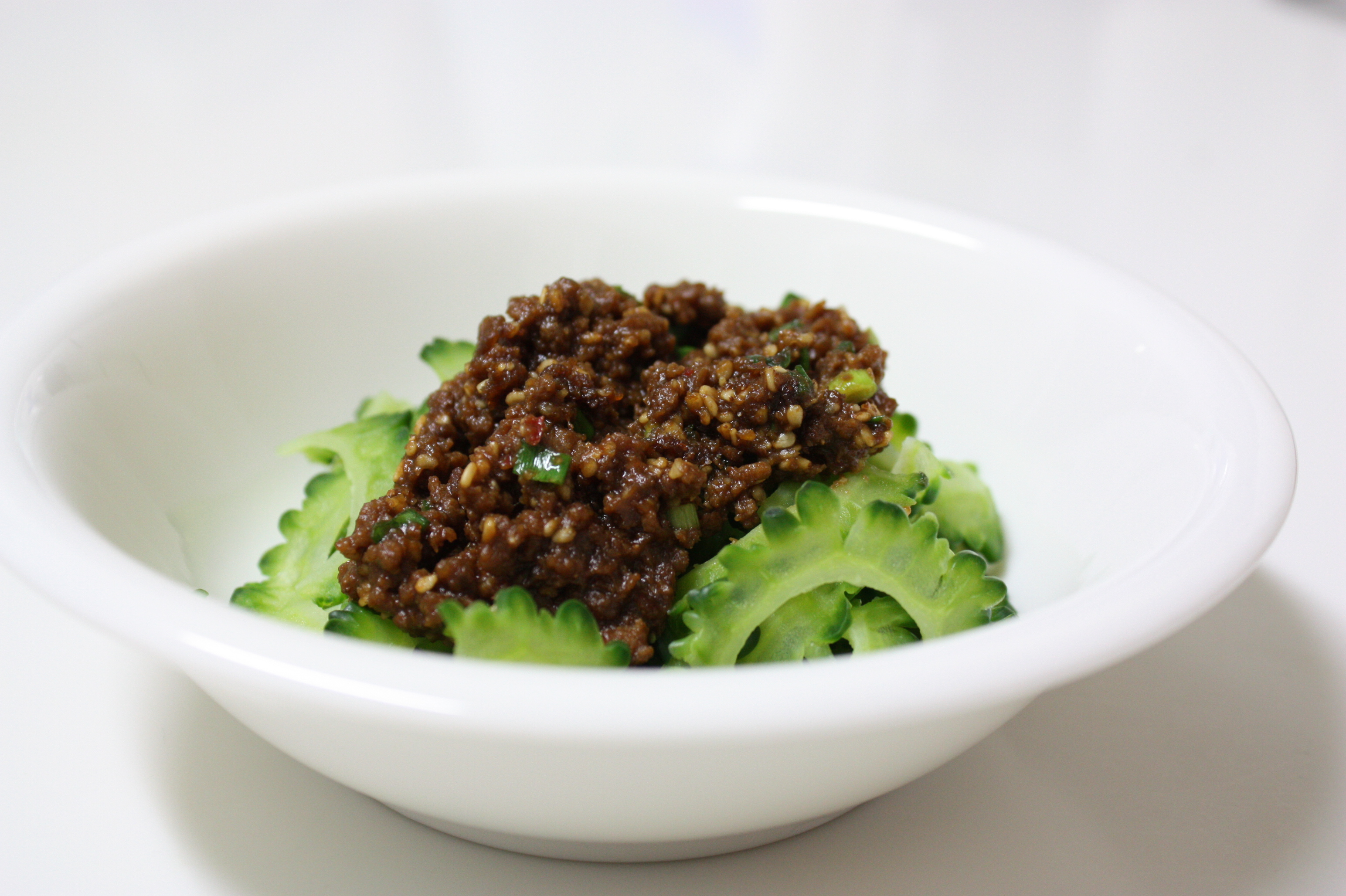 少し茹でて冷水に取ったゴーヤにミンチの赤みそ炒めを載せました。