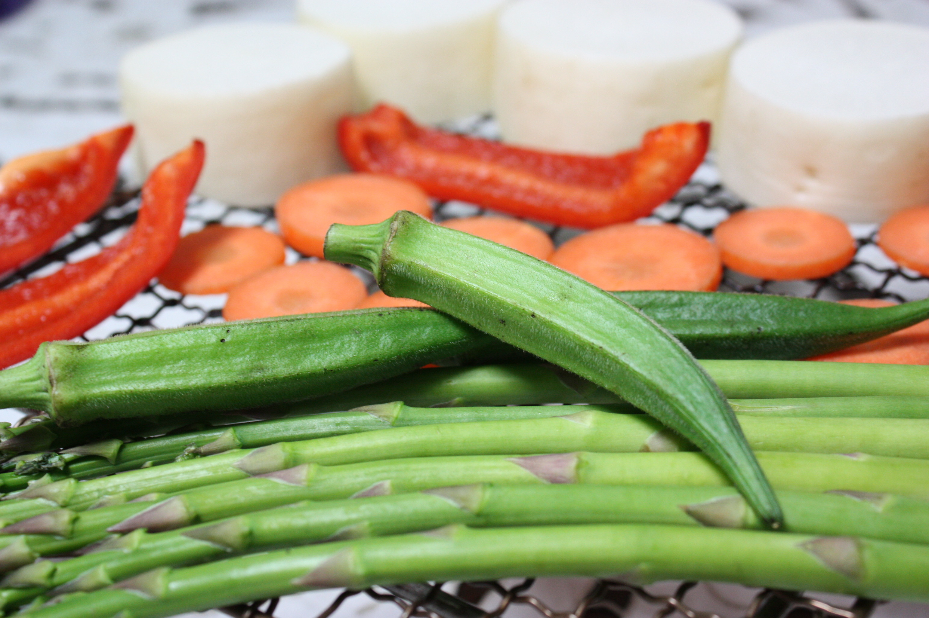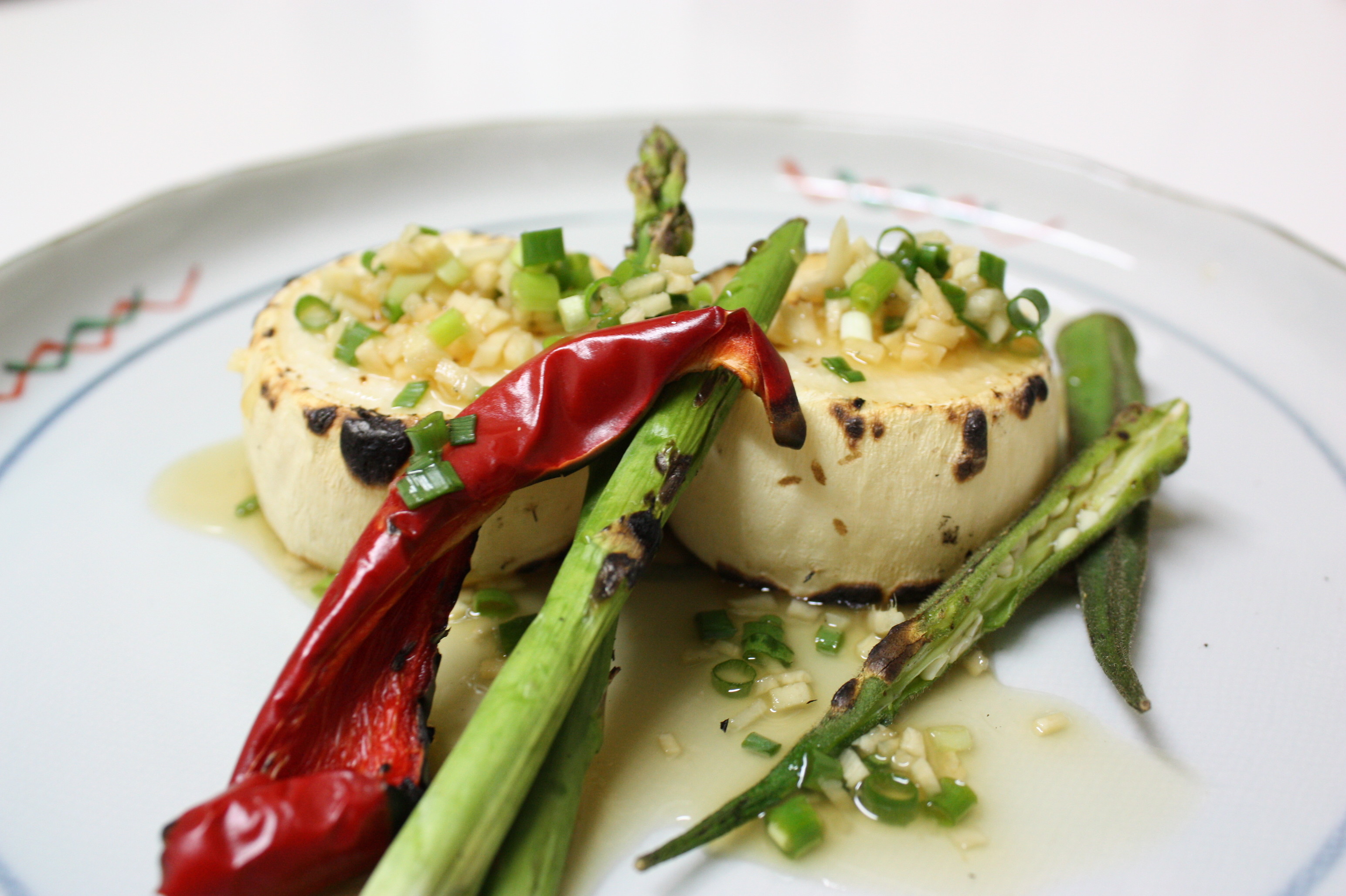これは、そんな日に二日ほど干した大根とパプリカとアスパラガス、それにオクラを網焼きにして、柚子を入れたお出汁に生姜のみじん切りとお葱を加えたドレッシングをかけました。