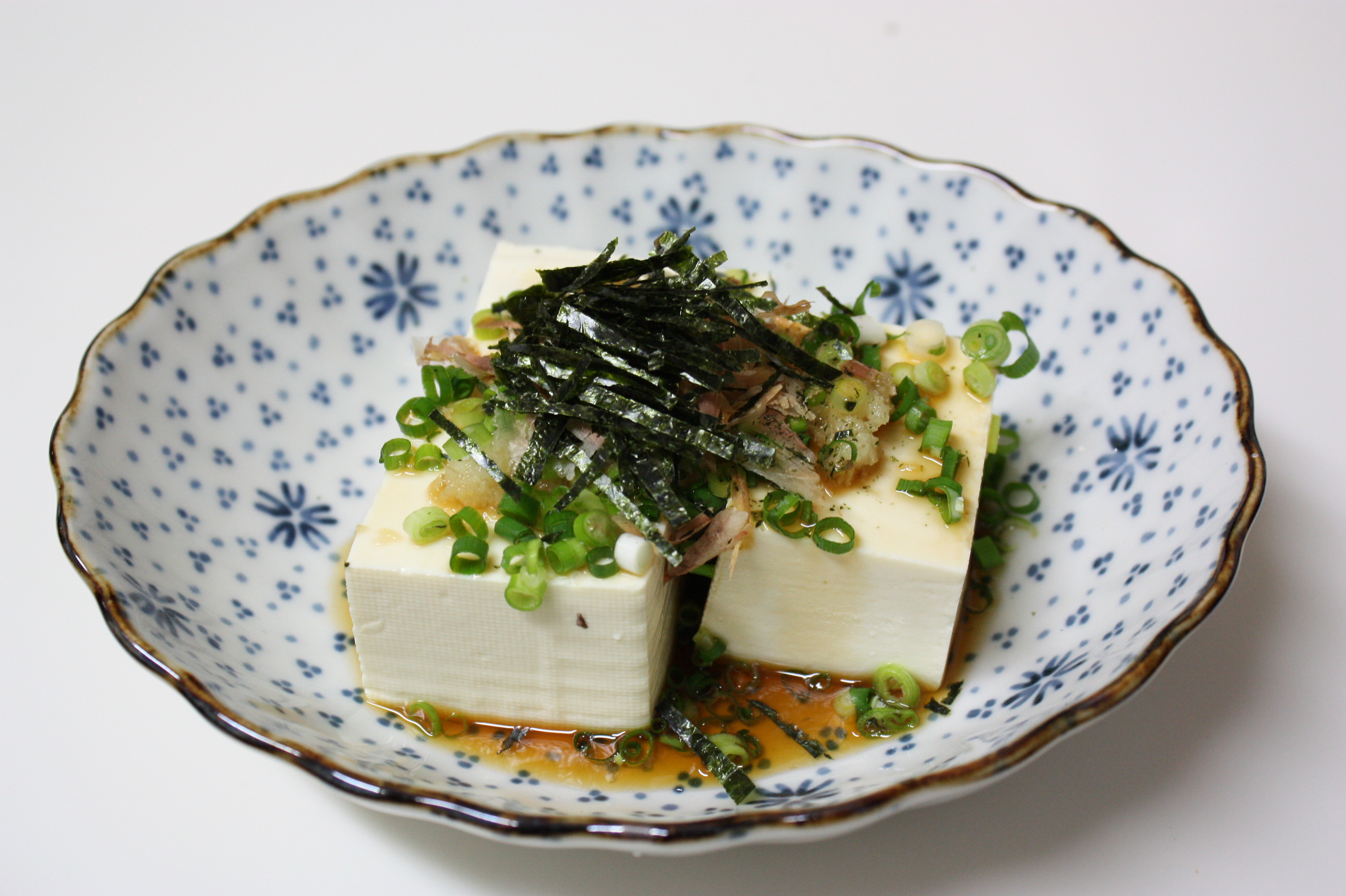 ベランダで生長中のゴーちゃんには、まだお花も咲いていませんが、すくすくと伸びています・・・楽しみ♪楽しみ♪夏の定番、冷奴ですが、今夜はトッピングも定番です。