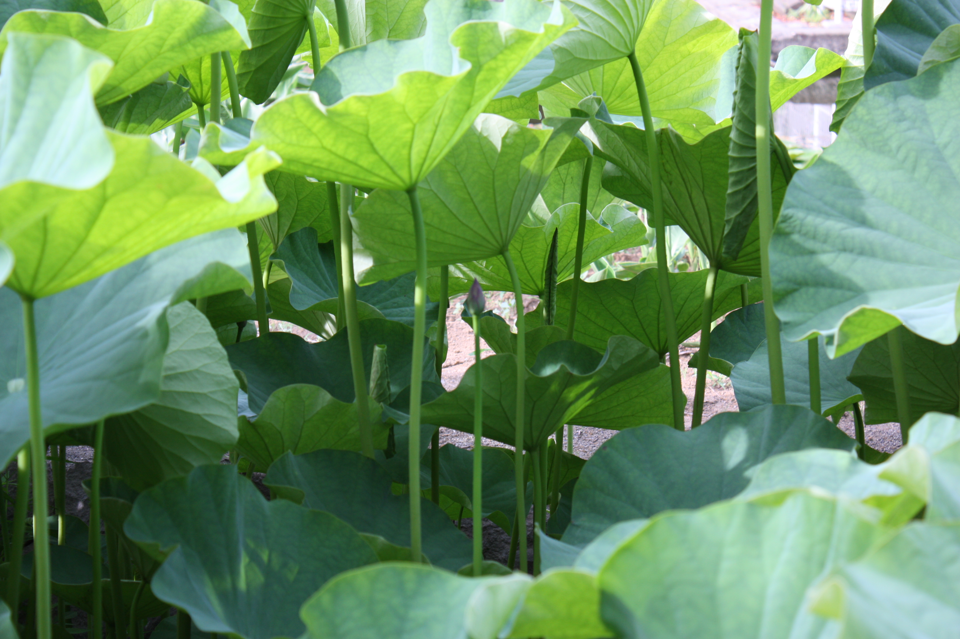ここの蓮にも、まだ蕾は少しだけしかついていません。・・・蕗ではありませんが、コロボックルが顔を出しそうでしょ?