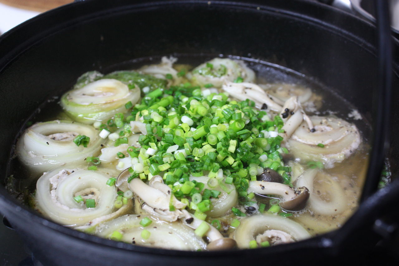 一番頻度の高いお鍋は、鶏肉とかきのお鍋ですが、こちら ↑ は、その日の気分でオーヴンかフライパンで少しだけ焼いた白菜に豚の薄切り肉を載せてお塩と胡椒をたっぷり振ってクルクル巻いて包んだ、お鍋です。