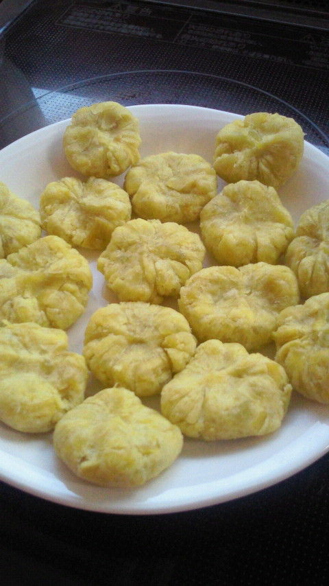 フォークで潰して、ラップで茶巾絞りのようにしました。