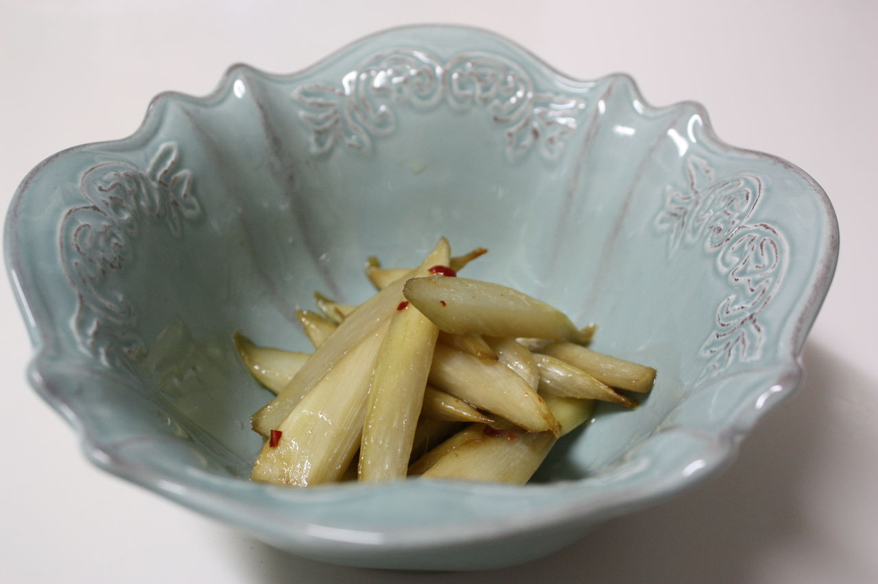 湯がいて烏賊とかあさりとかと酢味噌和えにしていただくのが専らの食べ方でしたが、先日、子豚のママさんがブログ、"ようこそ我が家へ" で、独活のきんぴらをご紹介くださっていたので、早速、作ってみました。