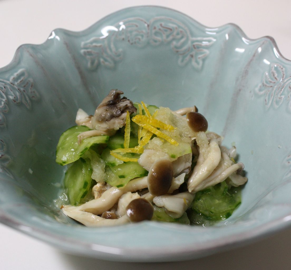 お塩もみした胡瓜とさっと茹でたきのこを大根おろしで和えて、柚子酢、お塩、お砂糖、お醤油などの調味料で味付けしました。