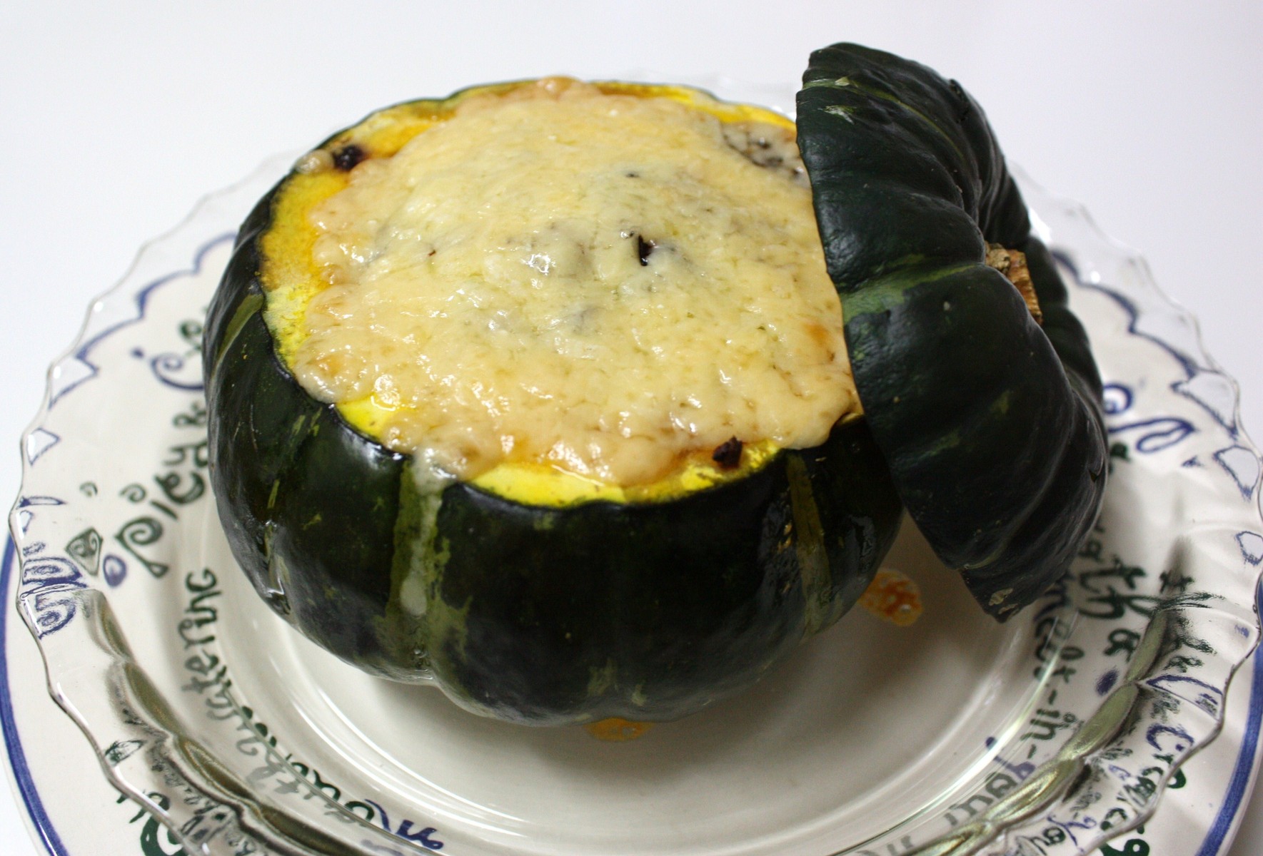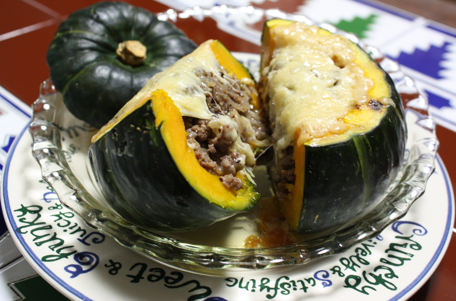 レンジした坊っちゃんかぼちゃの種の部分をくり抜いて、炒めた玉ねぎ、ハーブ、牛ミンチを詰めてチーズを載せて、オーヴンで焼きました。一人一個のつもりでしたが、作っていて半分ずつで十分かな〜って。