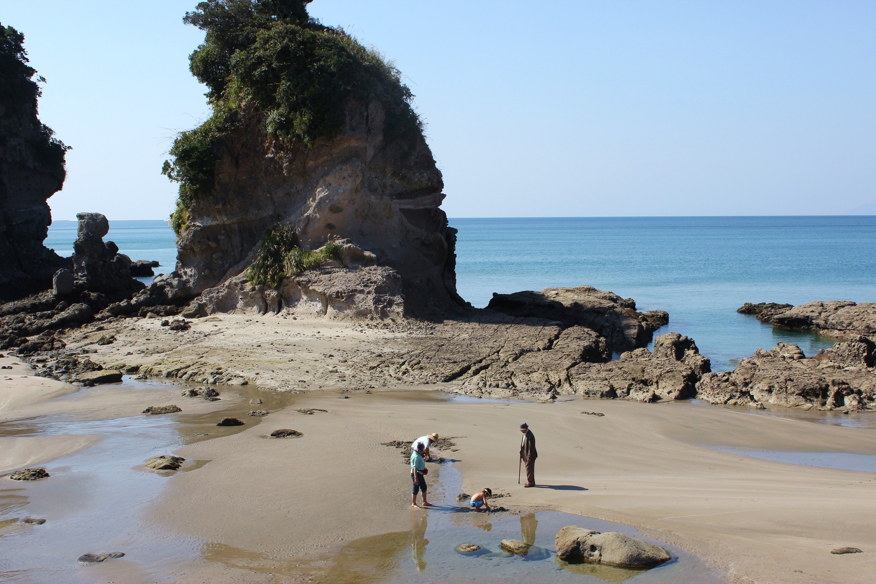 川内高城温泉を朝 8時過ぎのバスで西方へ。バスから見えた海は、潮が引いていて人形岩まで行けそうでした。
