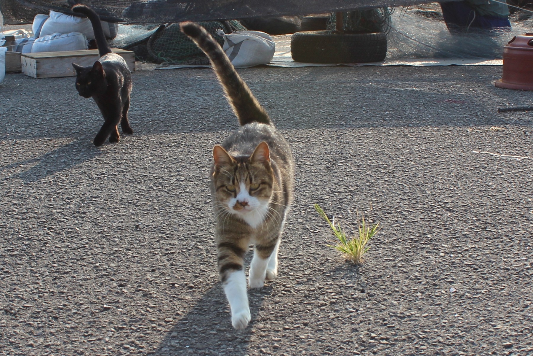 テーブルには、いろんなお菓子や果物がのり、お話も尽きず、今日もちっともお腰の上がらない父や Yおばさんを残して、私と従妹の Kちゃんは、夕日の人形岩を見に。 戻ったら猫たちが防波堤で遊んでいました。