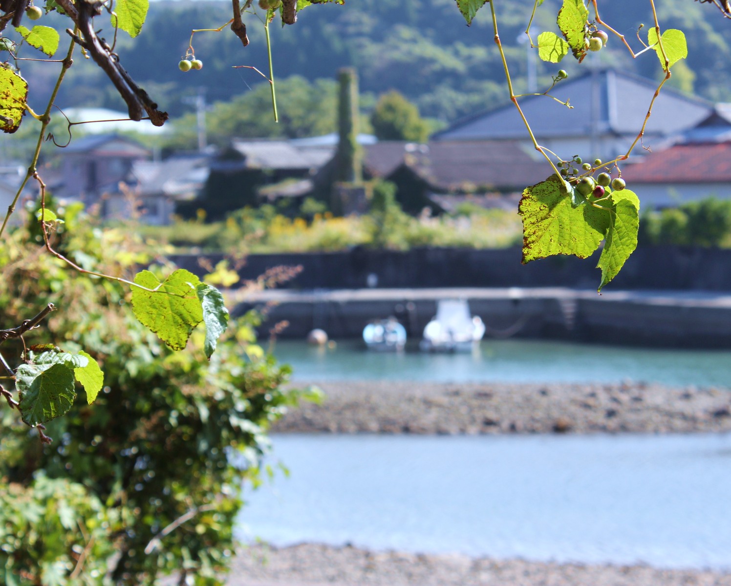 ↑ ぼやけていますが、向こうに見える焼酎製造所跡の煙突が蔦に覆われてしまっていました 2012年の煙突