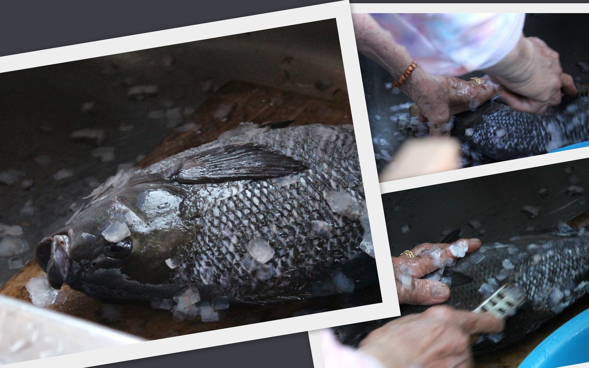 おばさんが豪快に鱗取りをなさった大きな黒鯛は、従妹の Rちゃんのご主人が夜釣って帰ってらしたもの。目が生きています。