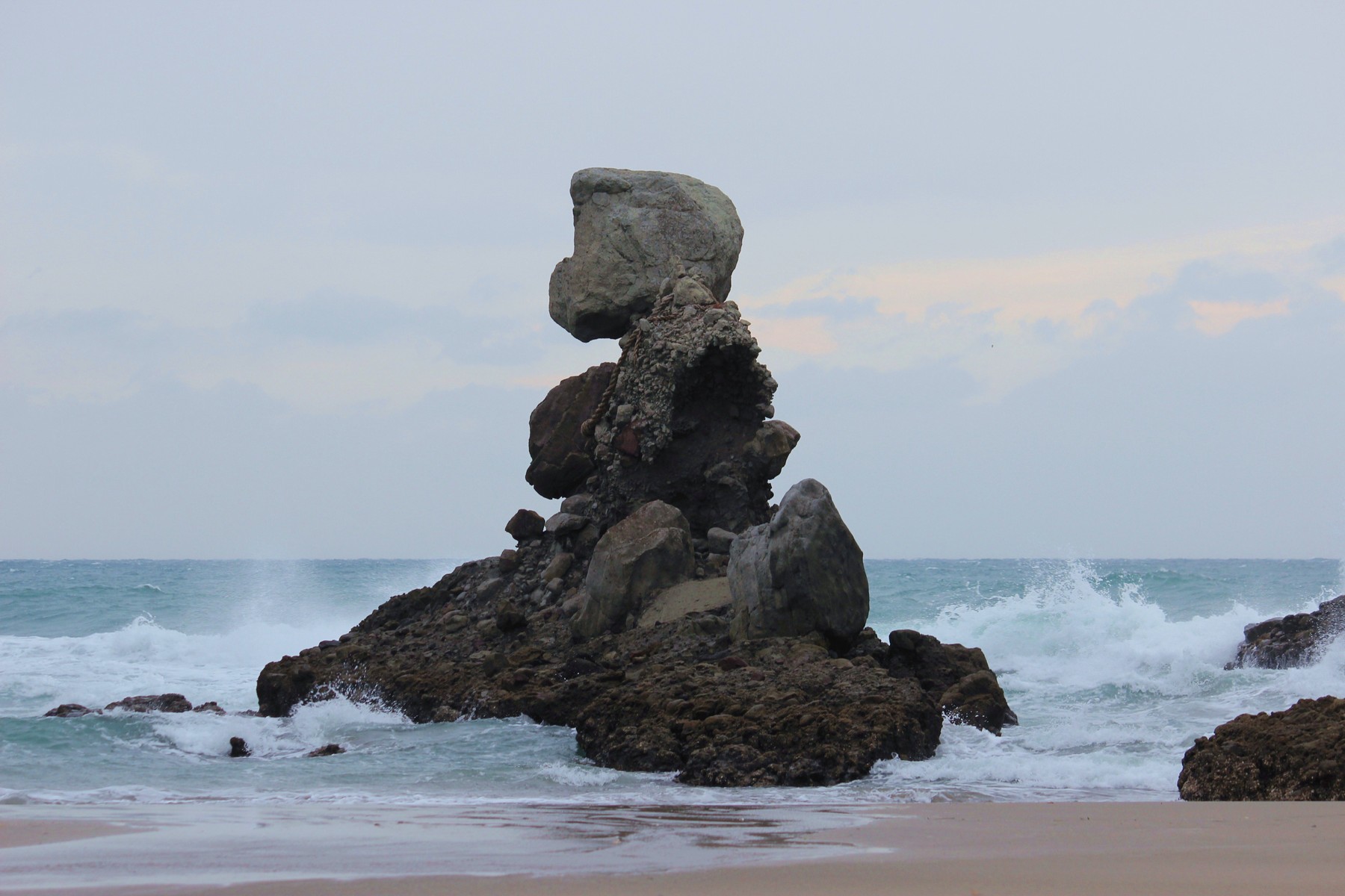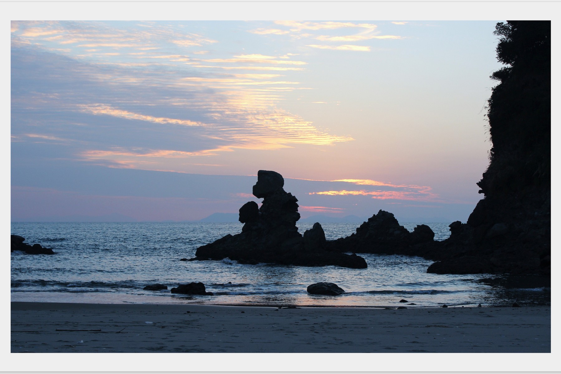 この日は、残念ながら雲があって綺麗な日没は見られませんでしたが、人形岩と夕陽、↑ のような感じ。