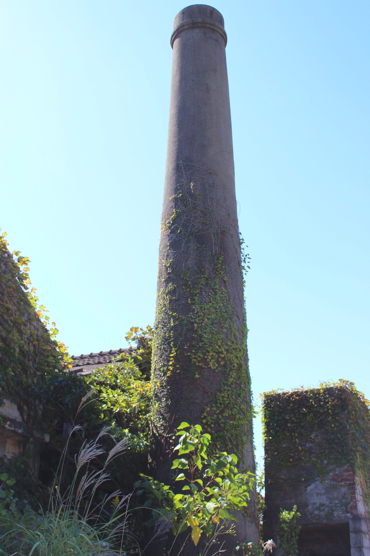 ↑ 今は荒れた廃屋とこの煙突だけが残る西方の焼酎醸造所。