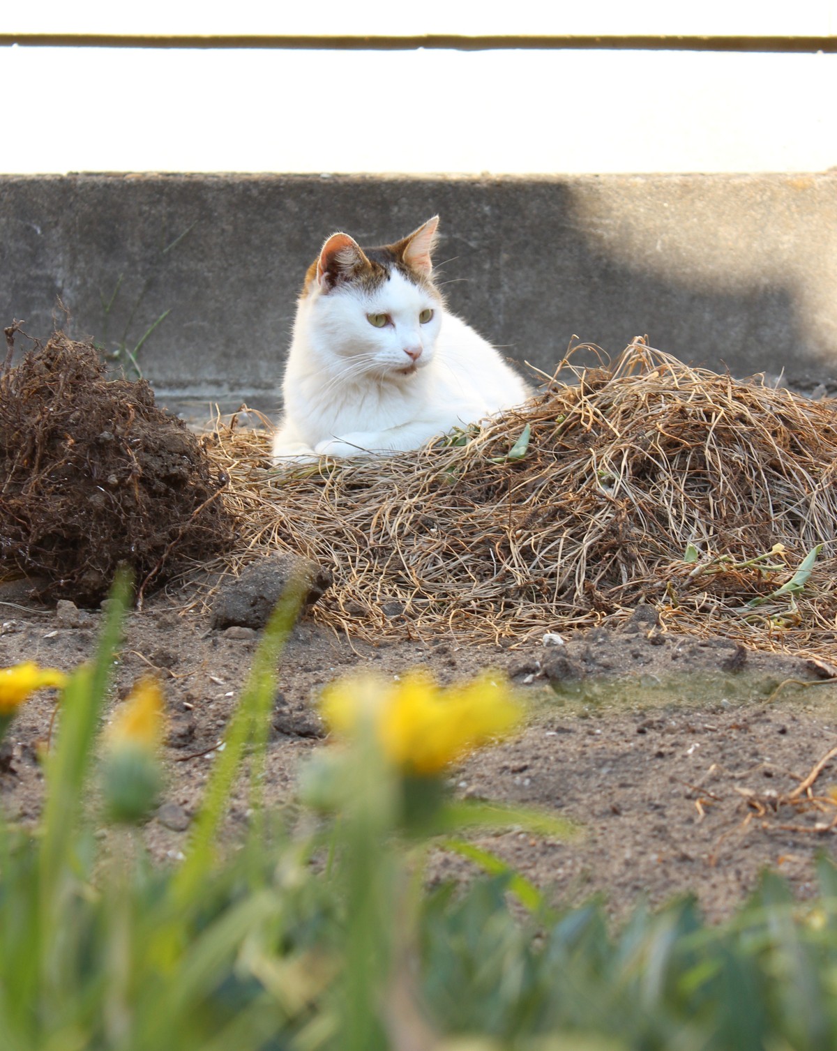 昨日、みかんの木の下で仔猫が2匹遊んでいた、とお聞きして探しに行ってみたけれど、仔猫はいなくて・・・脇道を通ってどこだか分からない場所へ出たら、この子 ↑ がいました。