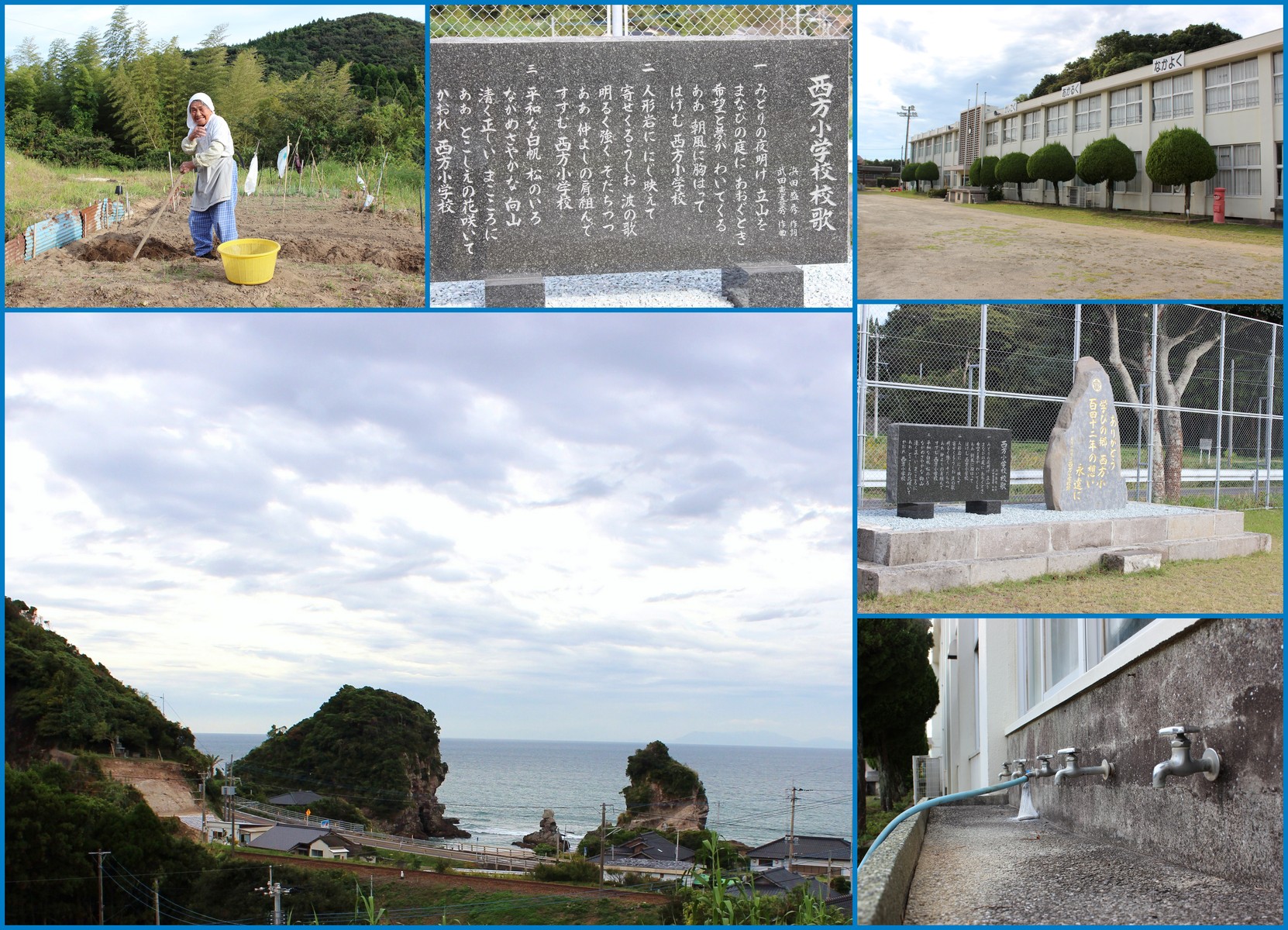 今年春、生徒数の減少で百四十二年の歴史を閉じて廃校になった西方小学校。 去年ここへ来た時 は、子供たちが走り寄って来てお話をしたり、ブランコをしている子供たちが居たのに・・・今は誰もいない学校です。