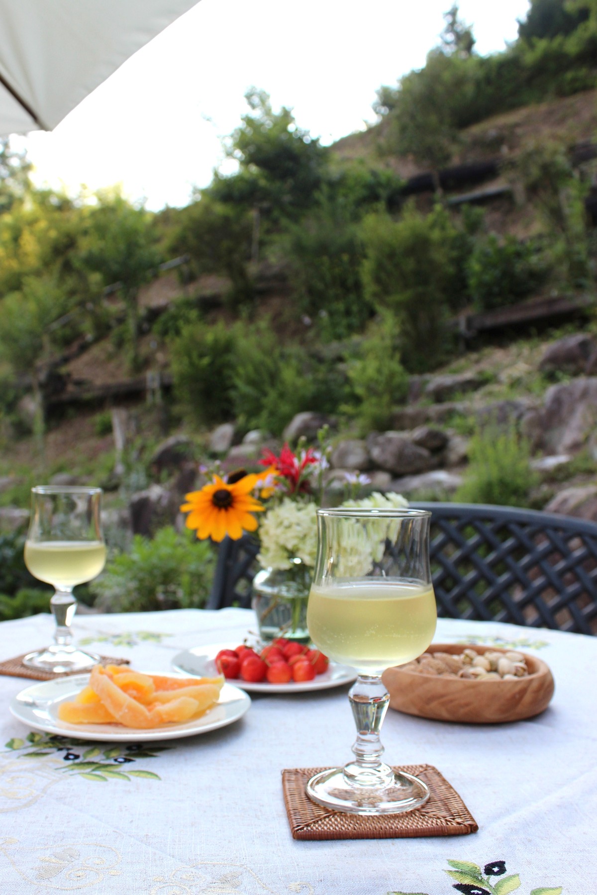 >シャンパーニュで乾杯の後は、お母さまが丹精籠められたお野菜やハーブと