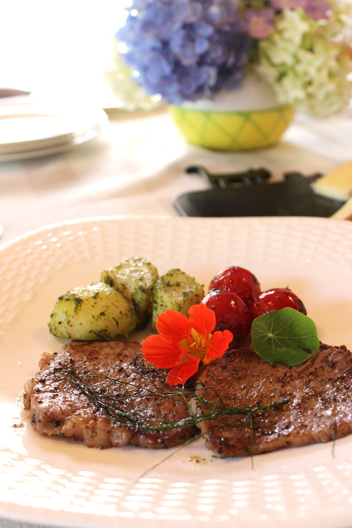 夏らしい冷たいスープには、お庭からのチャイブとナスタチュームの葉を浮かべて。