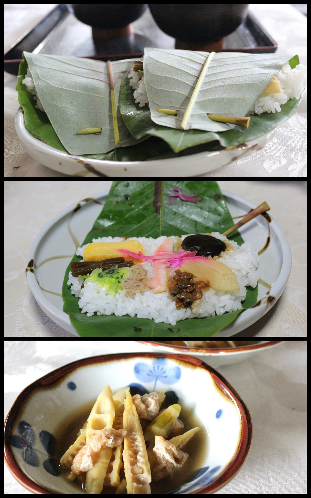 郷土料理の朴葉寿し。葉っぱを止めているのが茎っていうのも素敵です。
