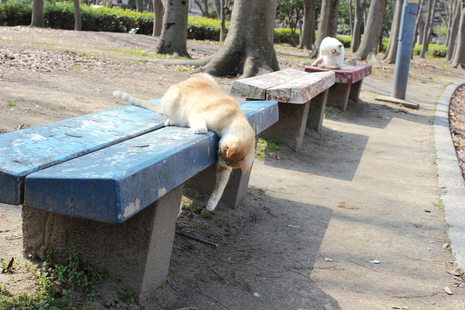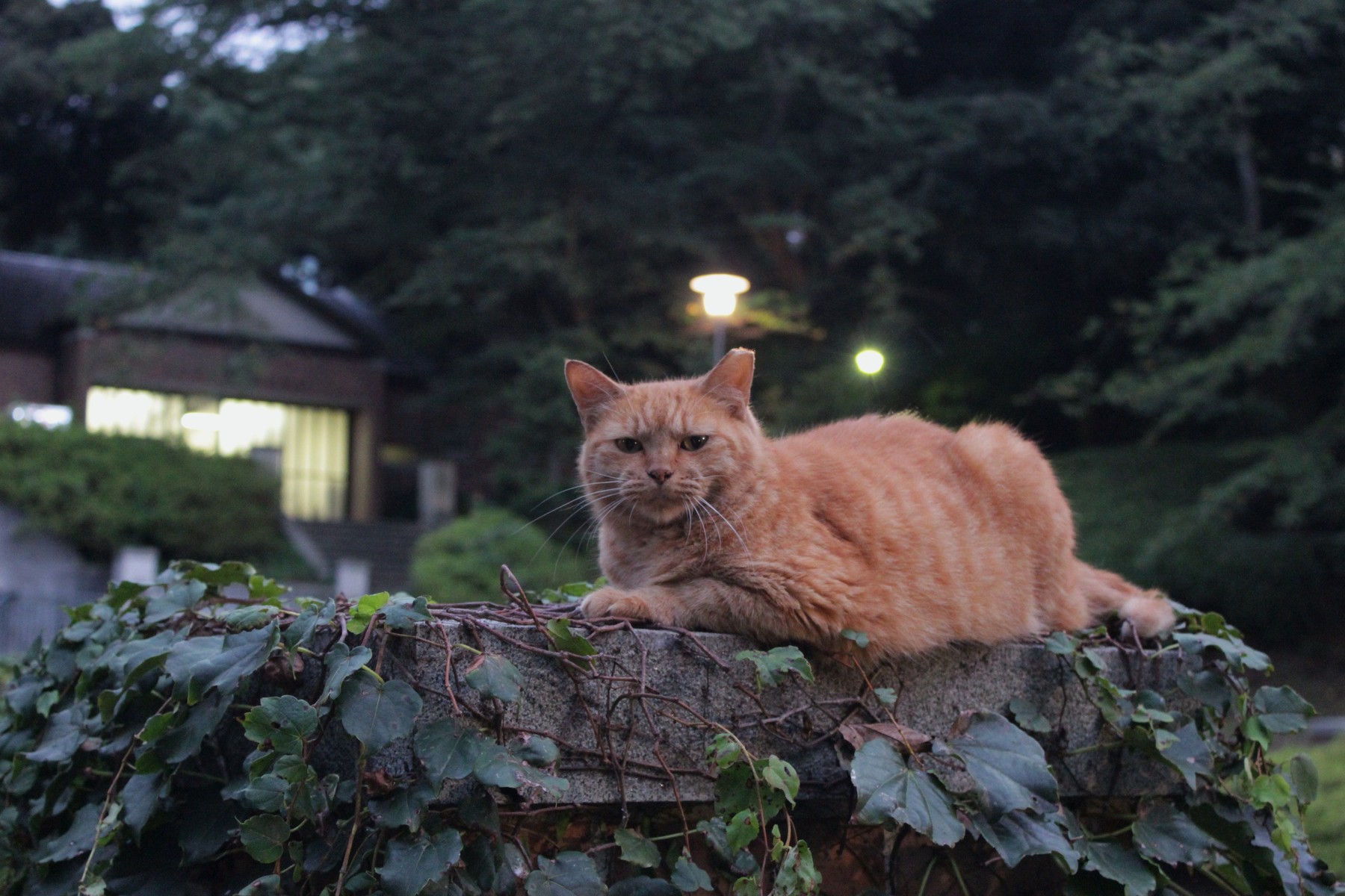 みんなお家に帰る頃、公園ニャーちゃんは石の柱の上でご飯待ち。