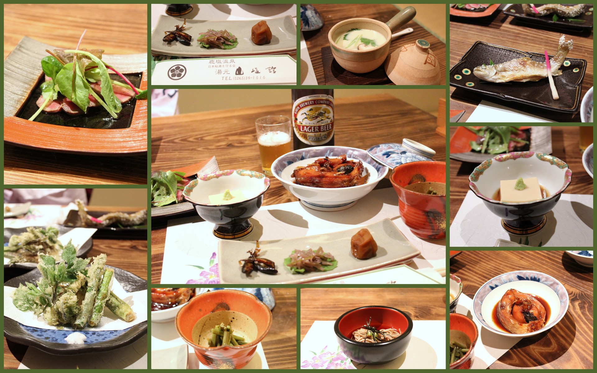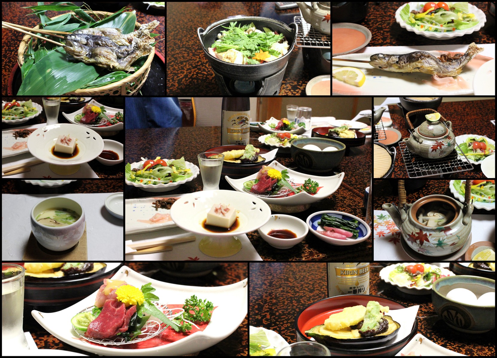 夕食のお料理。 一品浮いているのは、鹿のカルパッチョ・・・大鹿村ですから〜。冬にはジビエ料理のメニューもあるそうです。
