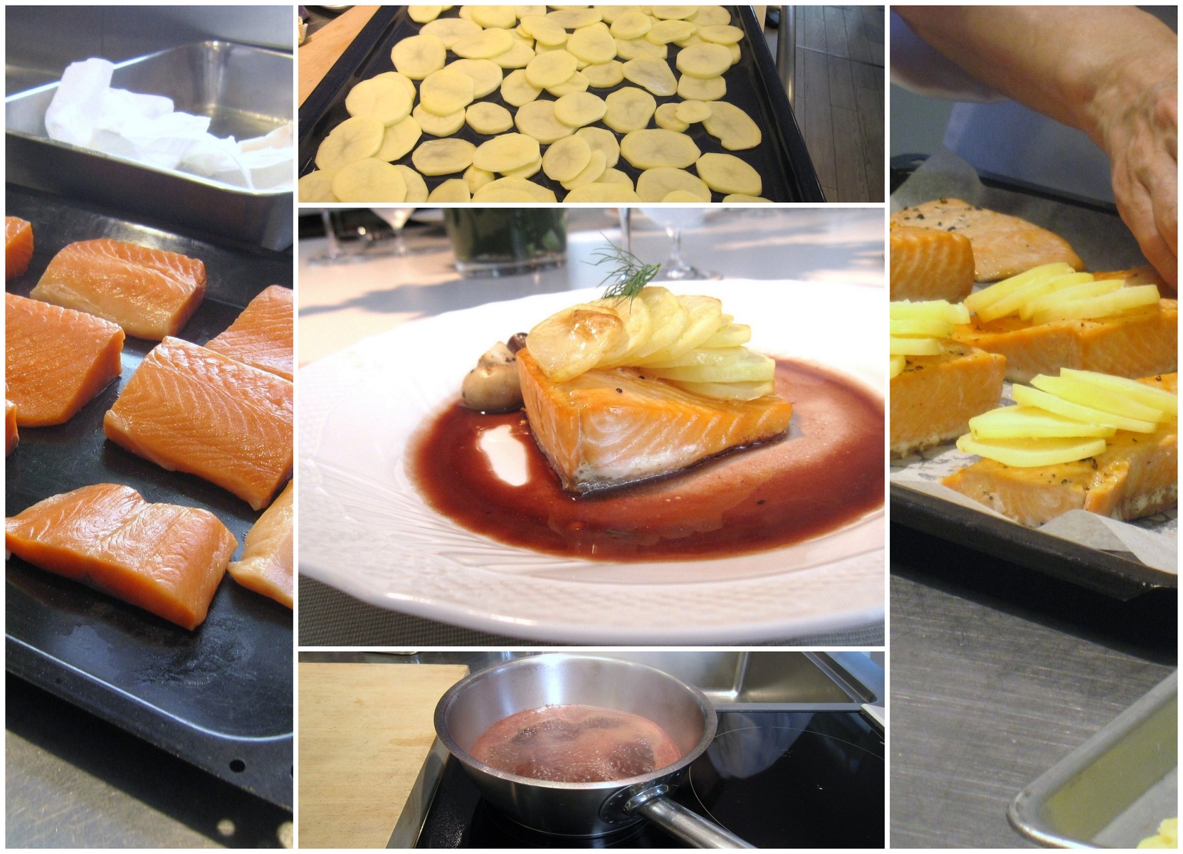 塩・胡椒したサーモンとじゃがいもを天板に並べてオーヴンで焼き、一旦取り出して、サーモンの上にじゃがいもを重ねて並べ、色付くまで焼きます。