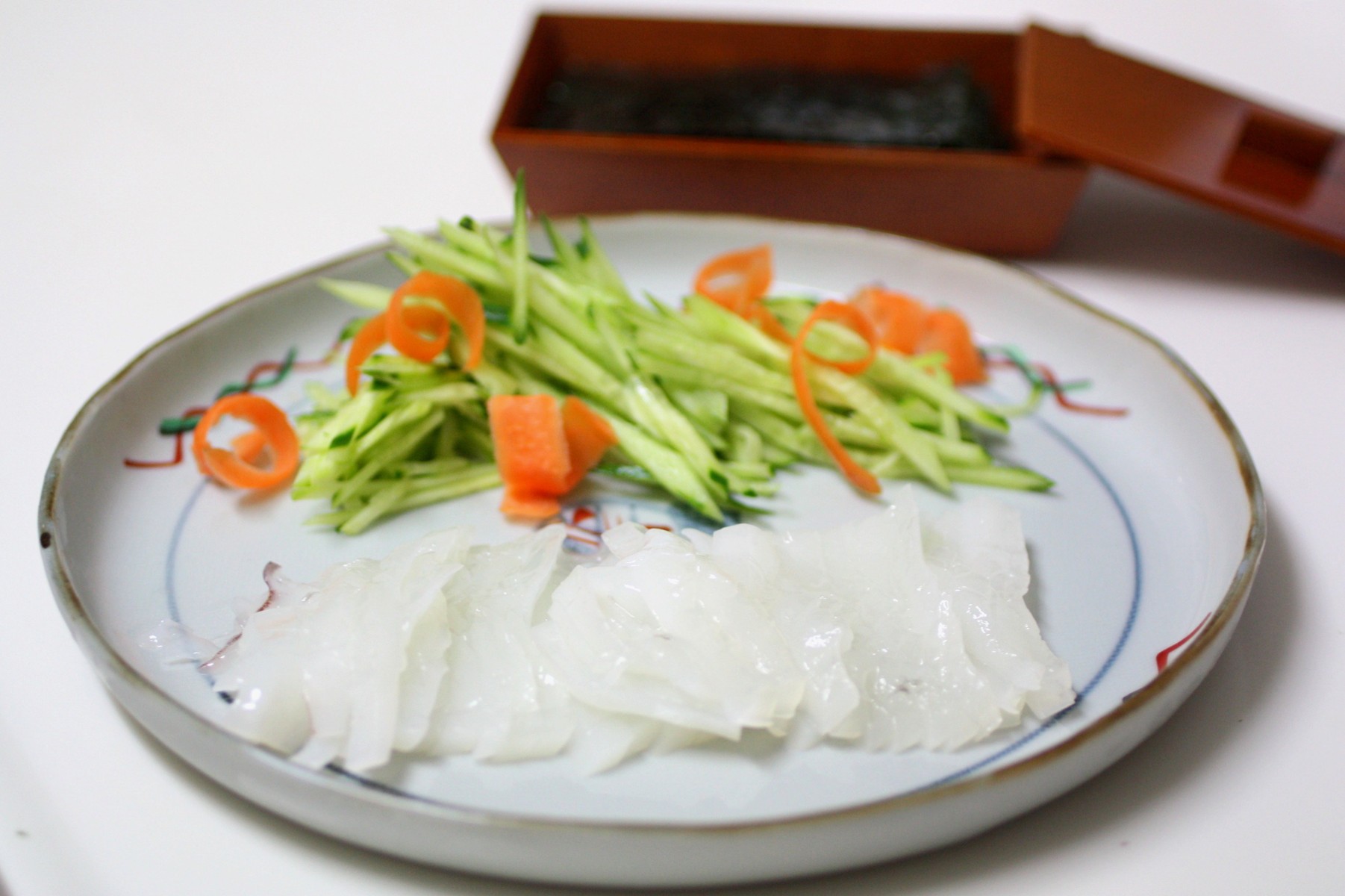 焼き海苔に細切りのきゅうりを載せ、いかを載せ、わさびをおいて、丸めてお醤油をつけてパクリといただきまぁ〜す。