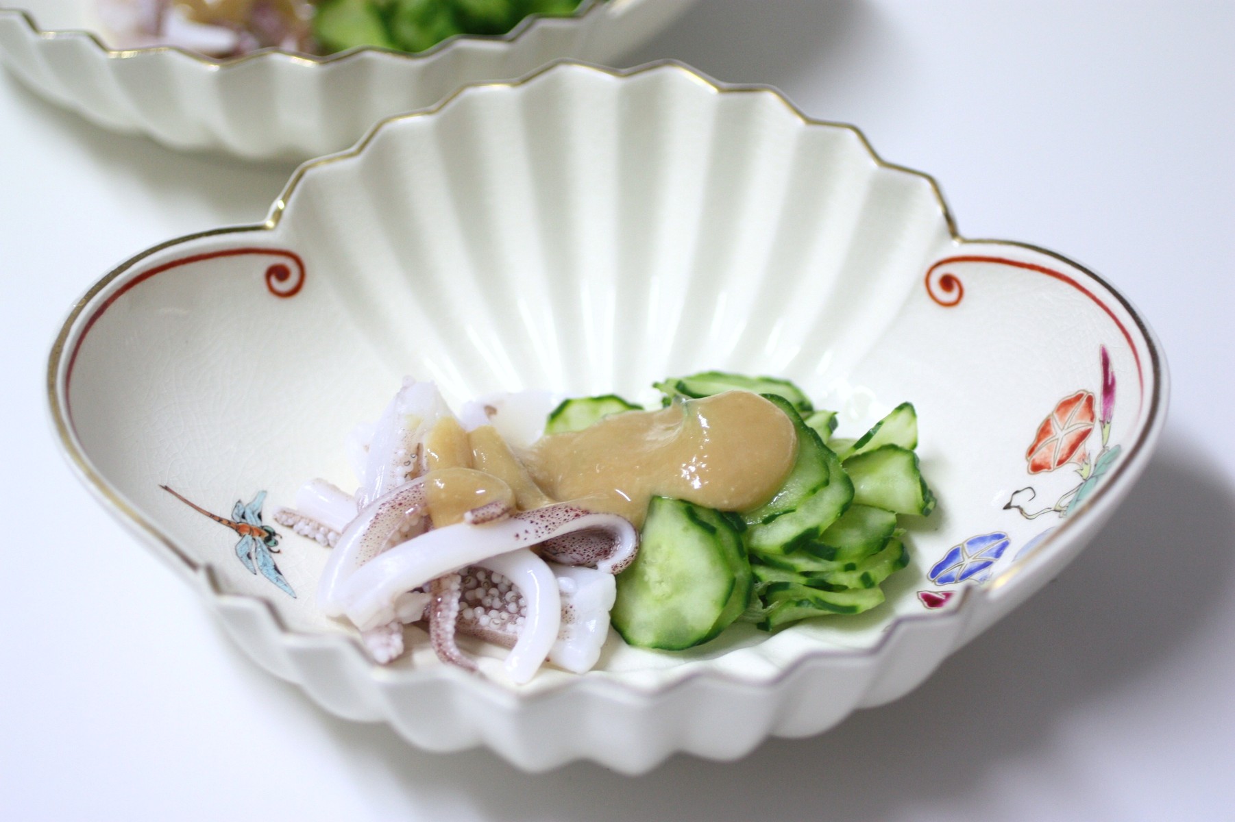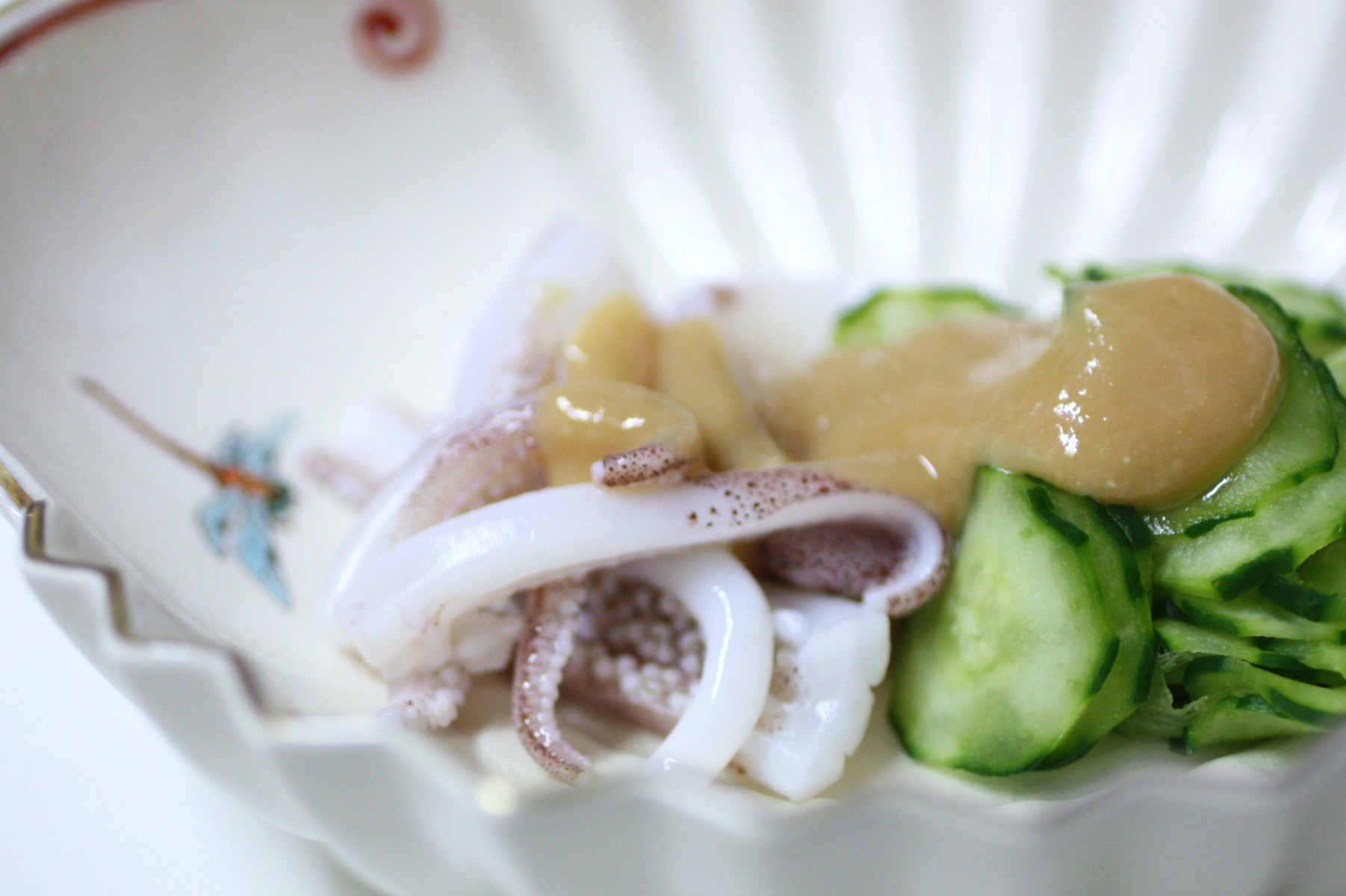 足はさっと湯引き後冷水に取り、塩もみしたきゅうりと合わせて、白みそのぬたで。