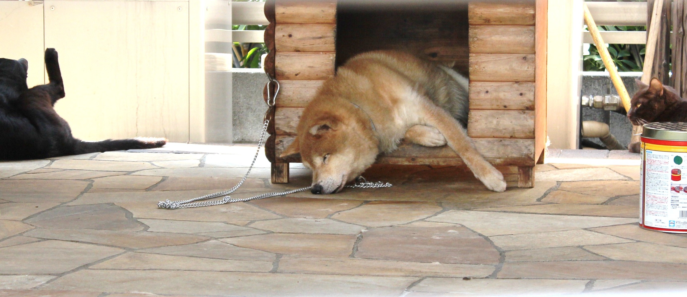 暑くてお家からはみ出しちゃった、ワンちゃん(^^)