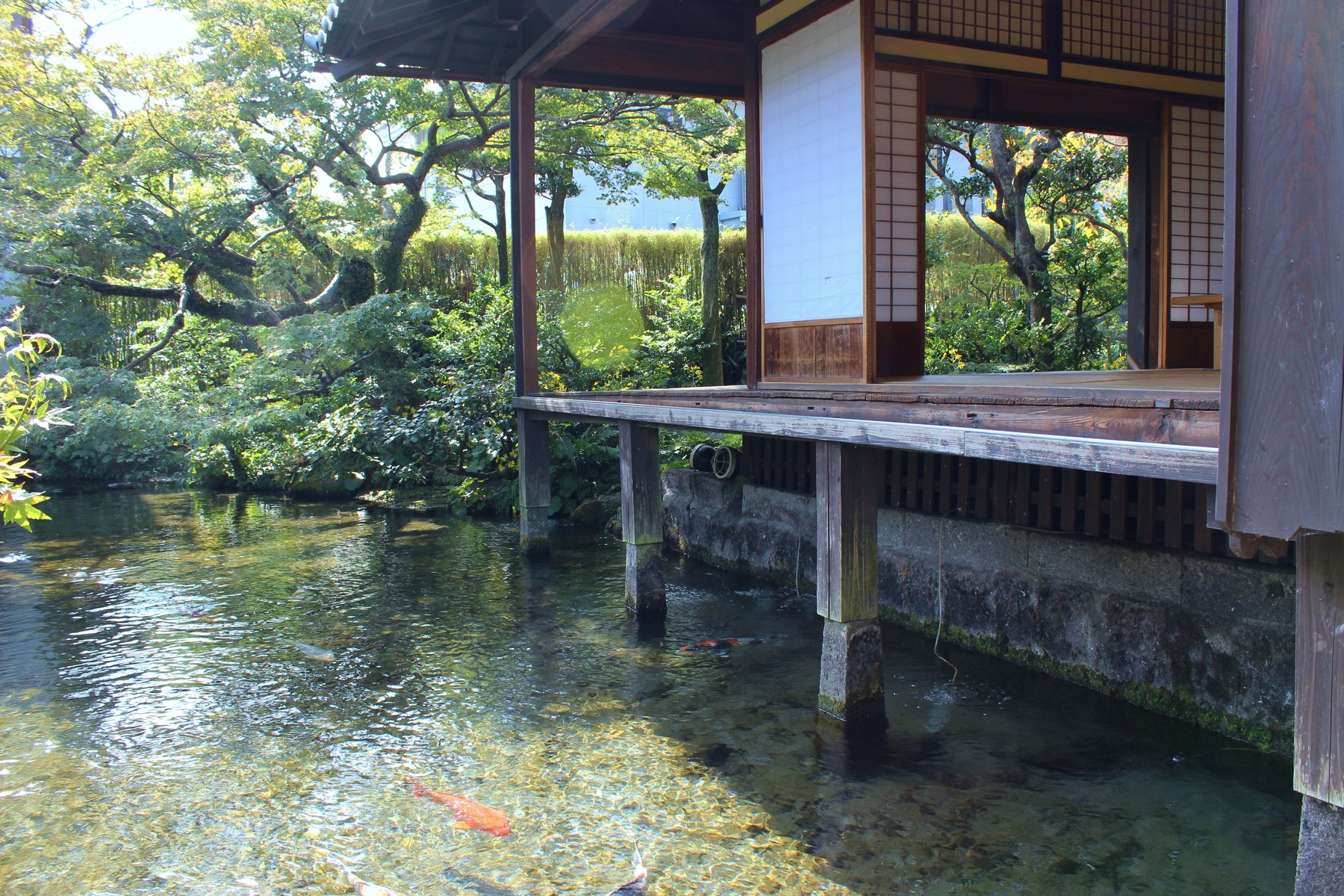 庭内にある大小 3つの池に一日 1000 トンの水が湧き出していて、小さいけれど緑が美しく情緒のある建物でした。