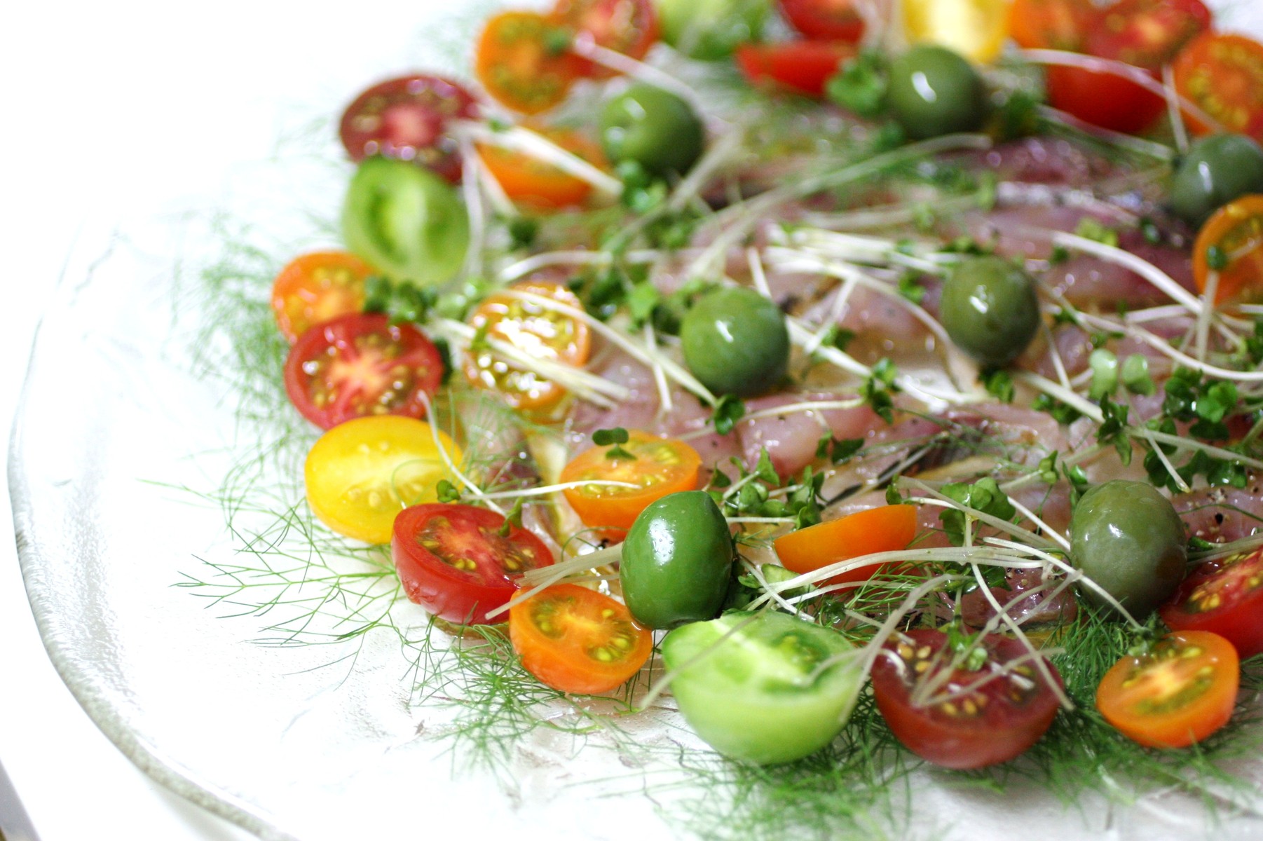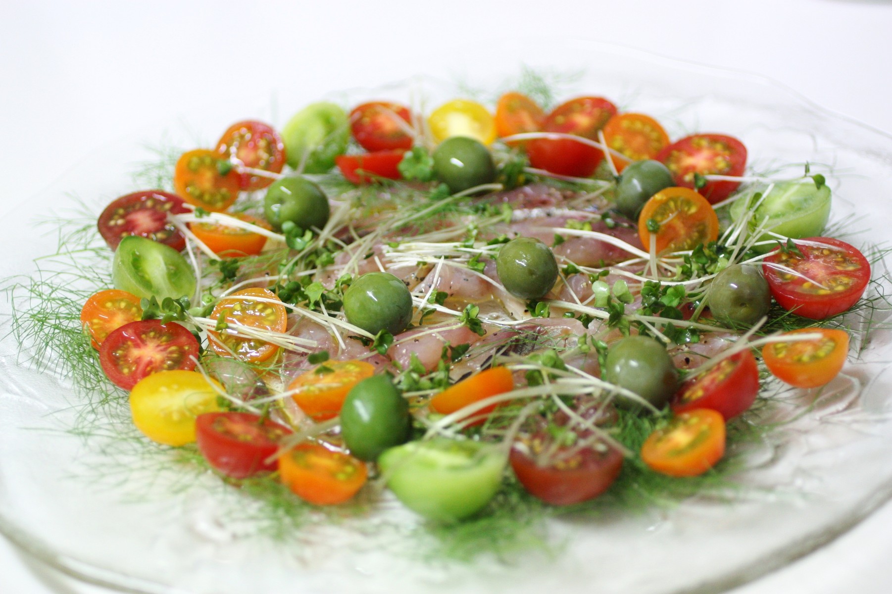 鯵は、塩・胡椒してレモンのゼストと一緒にオリーヴ・オイルでマリネしました。出来上がりにも塩・胡椒、レモン果汁、オリーヴ・オイルを振って、ブロッコリのスプラウトとグリーンのオリーヴも一緒に。