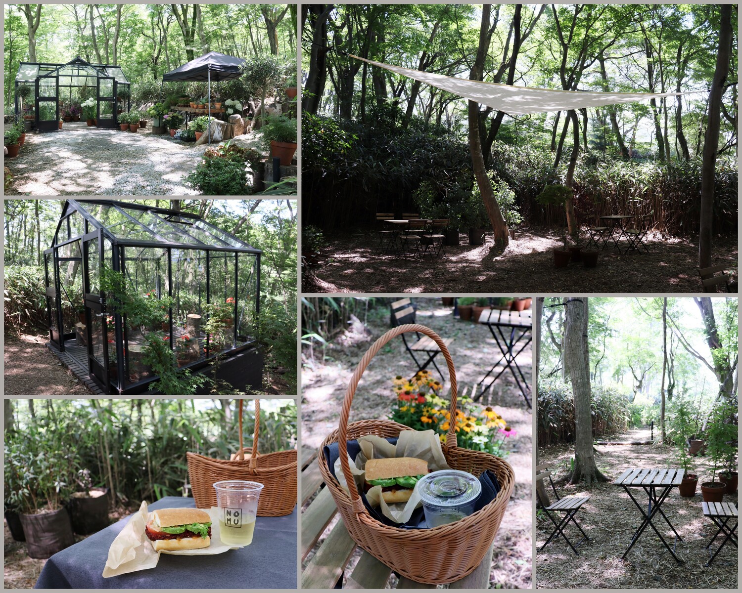 入り口にあるカフェ "NOMU hakone" のサラダやサンドイッチ、スィーツは、テイクアウトができ、バスケットに入れてくださいます。