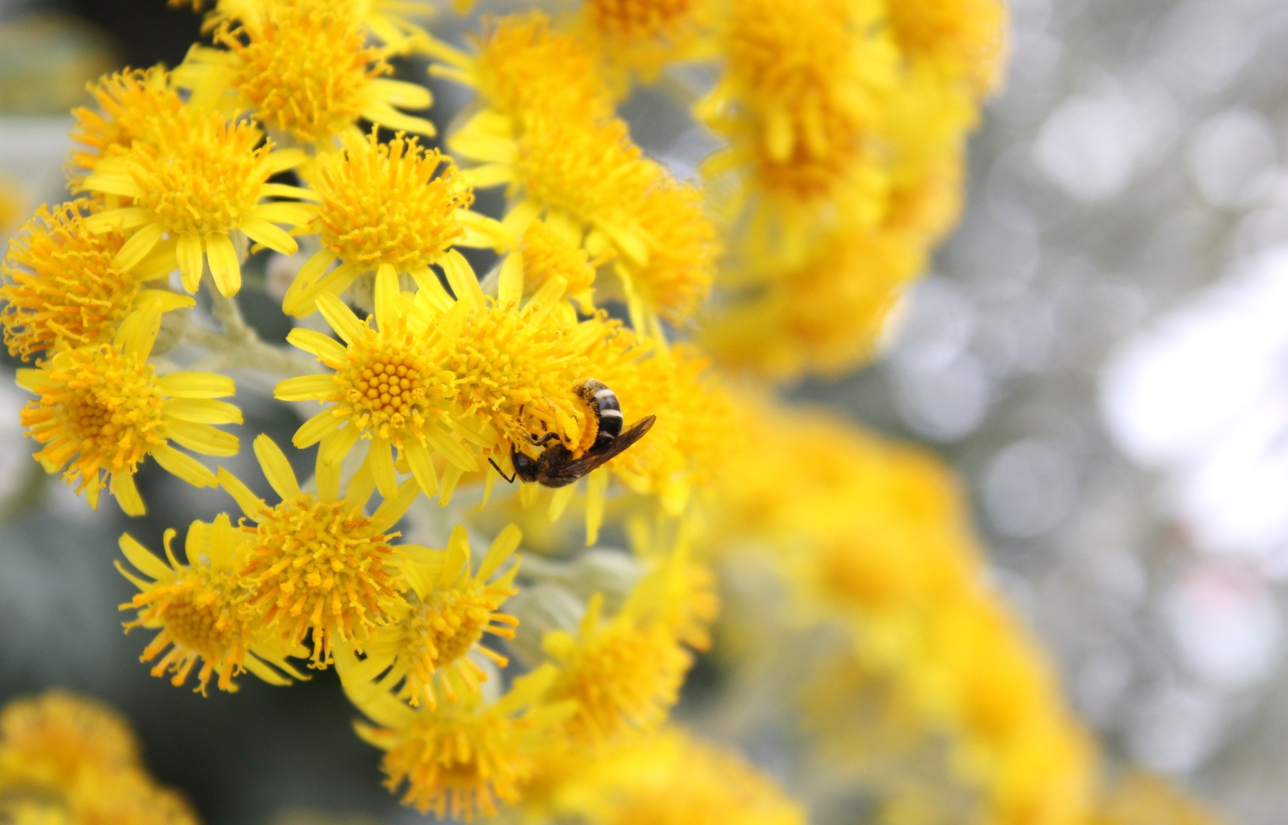 ↑ 江ノ電 "和田塚" 駅近くのお宅にあった黄色い花に小さな蜂がいました。
