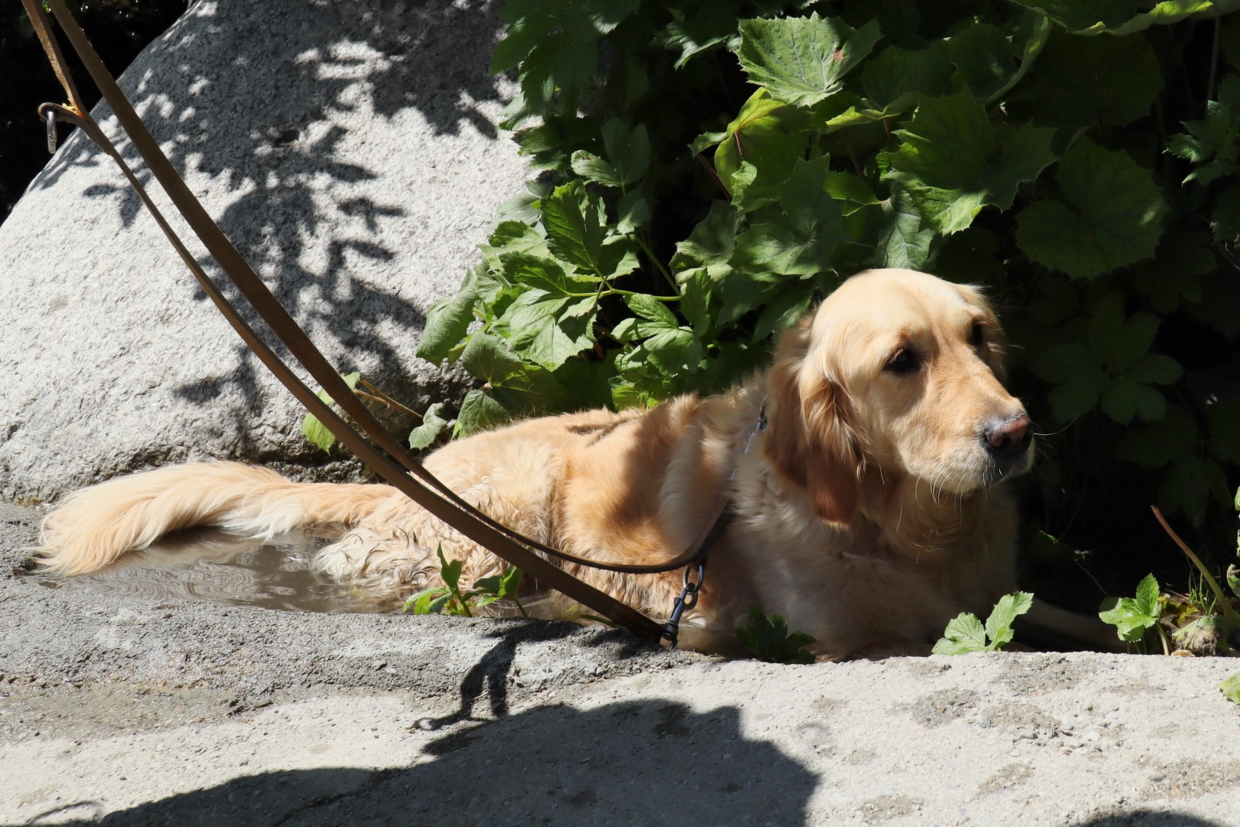 暑いので氷河からの冷たいお水に浸かって動かないワンちゃん。