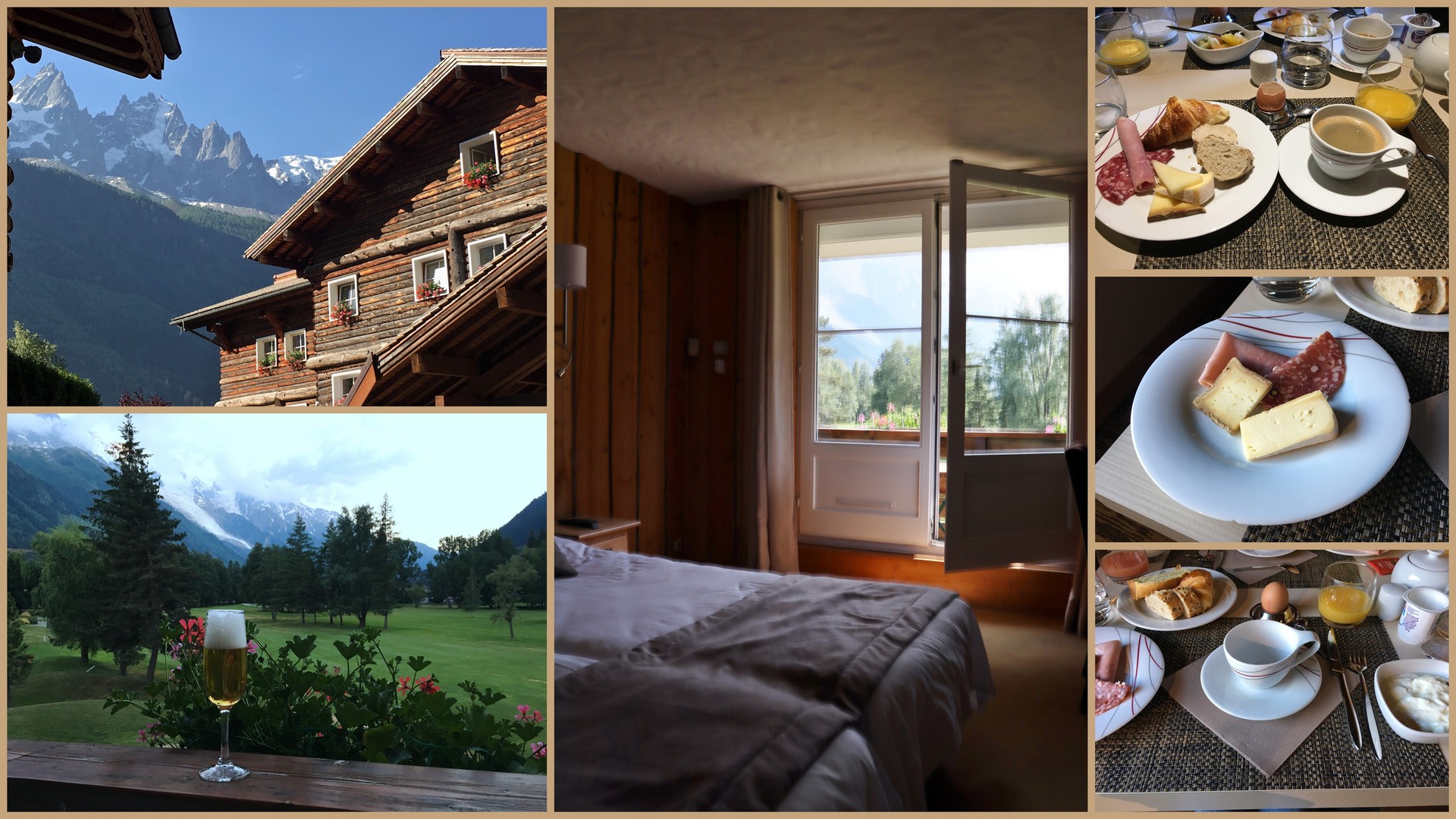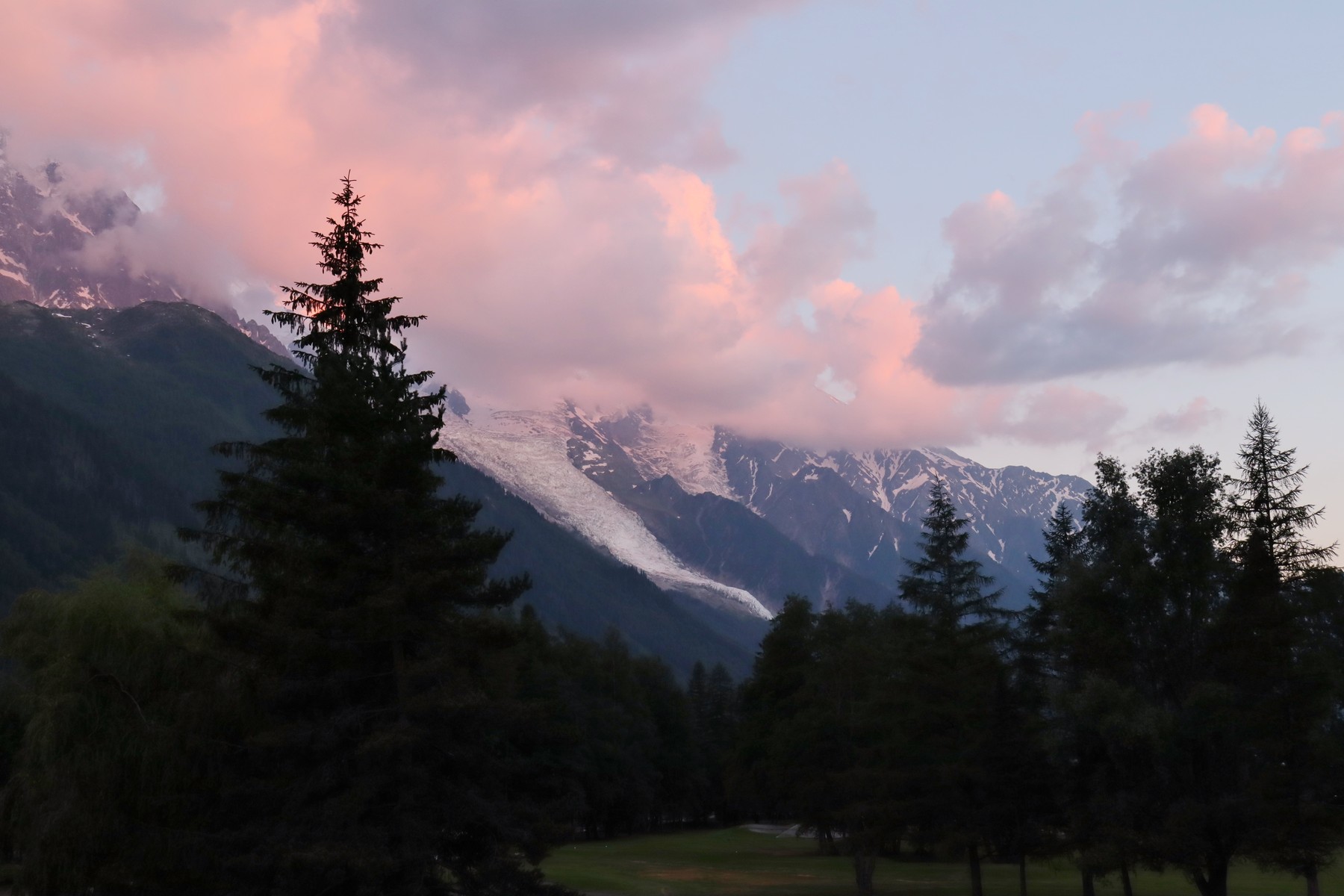 宿泊した Chamonix Mont-Blanc の一つ手前(スイス寄り) の Les Praz de Chamonix のホテルのベランダから見た Mont Blanc。